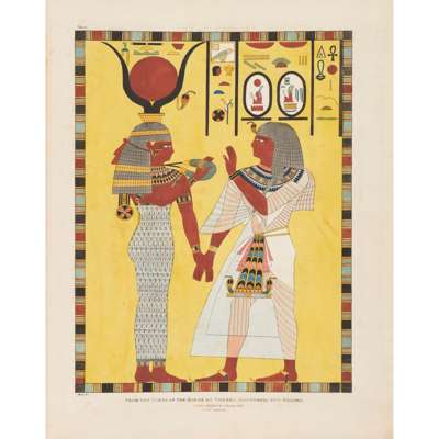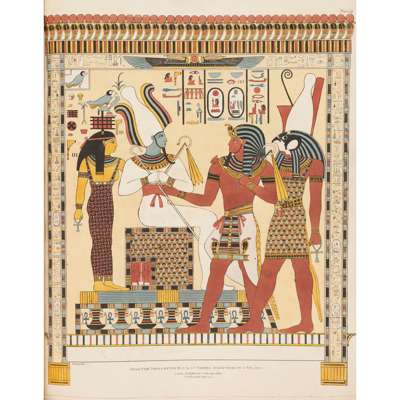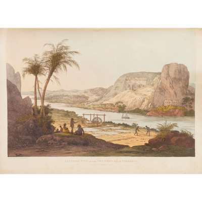 London: John Murray, 1822. First edition, broadsheets (61 x 46.5cm), original cloth-backed boards with printed label to front, 2 text-leaves (title-page and list of contents), 44 lithographic, etched or aquatint plates on 34 sheets (all but 4 hand-coloured, 2 folding), plates watermarked J. Whatman 1821, binding somewhat scuffed and marked with wear to extremities, a little light spotting to contents, one folding plate with short closed tear and small area of creasing [Abbey Travel 268; Blackmer 117] Together with 2 defective copies of the text volume, Narrative of the Operations and Recent Discoveries within the Pyramids, Temples, Tombs, and Excavations, in Egypt and Nubia, first and second editions, 1820 & 1821, both 4to, first edition in contemporary half calf, lacking most of spine, retaining portrait frontispiece but lacking other plate, second edition in contemporary full calf, with portrait frontispiece, folding map (spotted), one other plate, front cover detached, rear joint split (3)