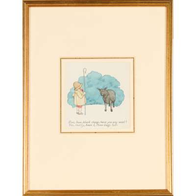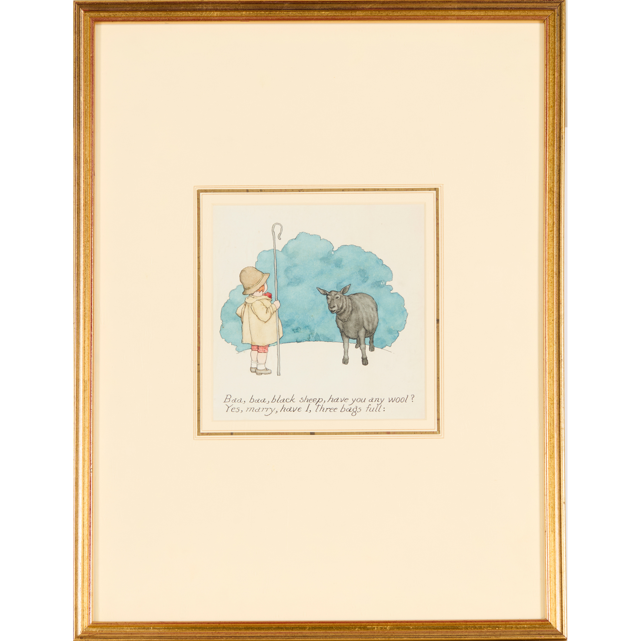 Original illustration, watercolour with pen and ink on paper, inscribed with title ‘Baa, baa, black sheep, have you any wool? Yes, marry, have I, three bags full', mounted, framed and glazed, mount aperture 14 x 13.5cm