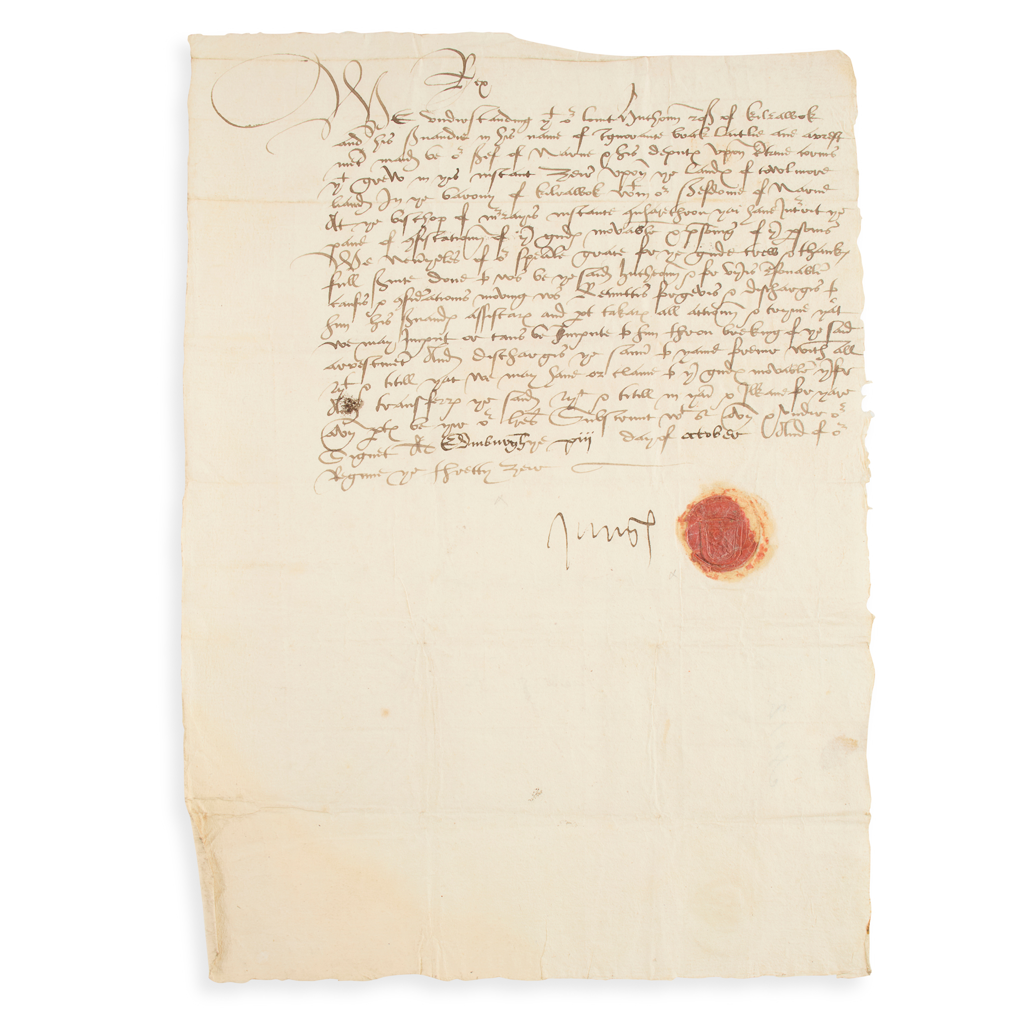 Regarding a recent feud between the 9th Baron and the Bishop of Moray: “…our louit Huchoun Rose of Kilrawok, and liis seruandis iu his name, of ignorance brak laitlie ane arrestment maid be our shiref of Narne…at the bischop of Murrayis instance, quharethrouu thai haue incurrit the pane of confiseatioun of ther gudis, movable and presoning of ther personis: We, neuertheles, of our speciale grace, for the gude, trew and thankfull seruice done to ws be the said Hucheoun and for vtheris resonable causis and considerationis moving ws, remittis, forgevis. and dischargis to him, his seruandis, assistaris and pert takaris, all actioun and cryme that we may imput or cans be impute to him throu breking of the said arrestment, and dischargis the samin to tharae foreuir, with all rycht and titill that we may haue or clame to ther gudis movable therfor. and transferris the said rycht and titill in thaim and iikane for thare avin pertis be thir our lettres…”, signed James R., with remnants of seal, 18 lines on paper, 19.5 x 27cm [Rose, Shaw & Innes p.207]