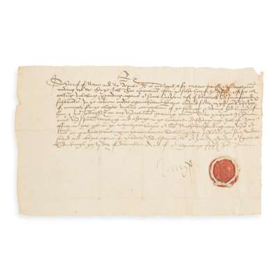 Addressed to the Sheriff of Nairn, dated 6th December 1542, requesting that he: “…desist and cese fra all calling, vnlawing, and proeeding aganis our louit Huchoun Rose of Kilrawak, his sone, frendis and subtenentis, in the actioun movit aganis thame be ane reuerend fader in God Patrik bischop of Murray, for the allegeit violent occupatioun of the stedingis and rovmj's had be thaim of him and his predecessouris, or ony vthir aetionis concerning thame, vnto the time ye haue oure vther speciale vryting and charge in the contrare…", signed James R., with seal, 11 lines on paper, 21.5 x 13cm [Rose, Shaw & Innes p.208]