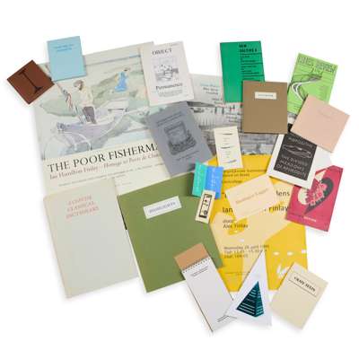 Textbook. Wild Hawthorn Press, 1999; Crate Texts. Wild Hawthorn Press, n.d.; Instruments of Revolution, 1992; Four Monostichs, n.d.; 4 Baskets. Wild Hawthorn Press, 1990; 6 Proverbs. Wild Hawthorn Press, 1997; Redoubt, 1994; Kamikaze Butterflies [&] Cherry Blossom Splinters, possibly a proof, n.d.; Jacobin Definitions. Wild Hawthorn Press, 1991; Exchanges. Wild Hawthorn Press, 1999; Hints and Tips for Boat Modellers. Wild Hawthorn Press, 1999; Variations. Wild Hawthorn Press, 1999; Myths. Wild Hawthorn Press, 1991; Midway 3. Wild Hawthorn Press, n.d.; Object Permanence, June 1996, including contributions from Ian Hamilton Finlay; Picpus. Wild Hawthorn Press, 1995; Wildwachsende Blumen, 1994; Painting by Numbers. Wild Hawthorn Press, 1997; Swatchway. Wild Hawthorn Press, n.d.; Ian Hamilton Finlay: Selected Landscapes. New Arcadian Journal 61/62; Gillanders, Robin. Ian's Fleet, 2002; A Concise Classical Dictionary. Christmas 1998; “Fill in the Flowers with colours from the palette below”. Wild Hawthorn Press, number 62 of 350 signed copies; and many others;
