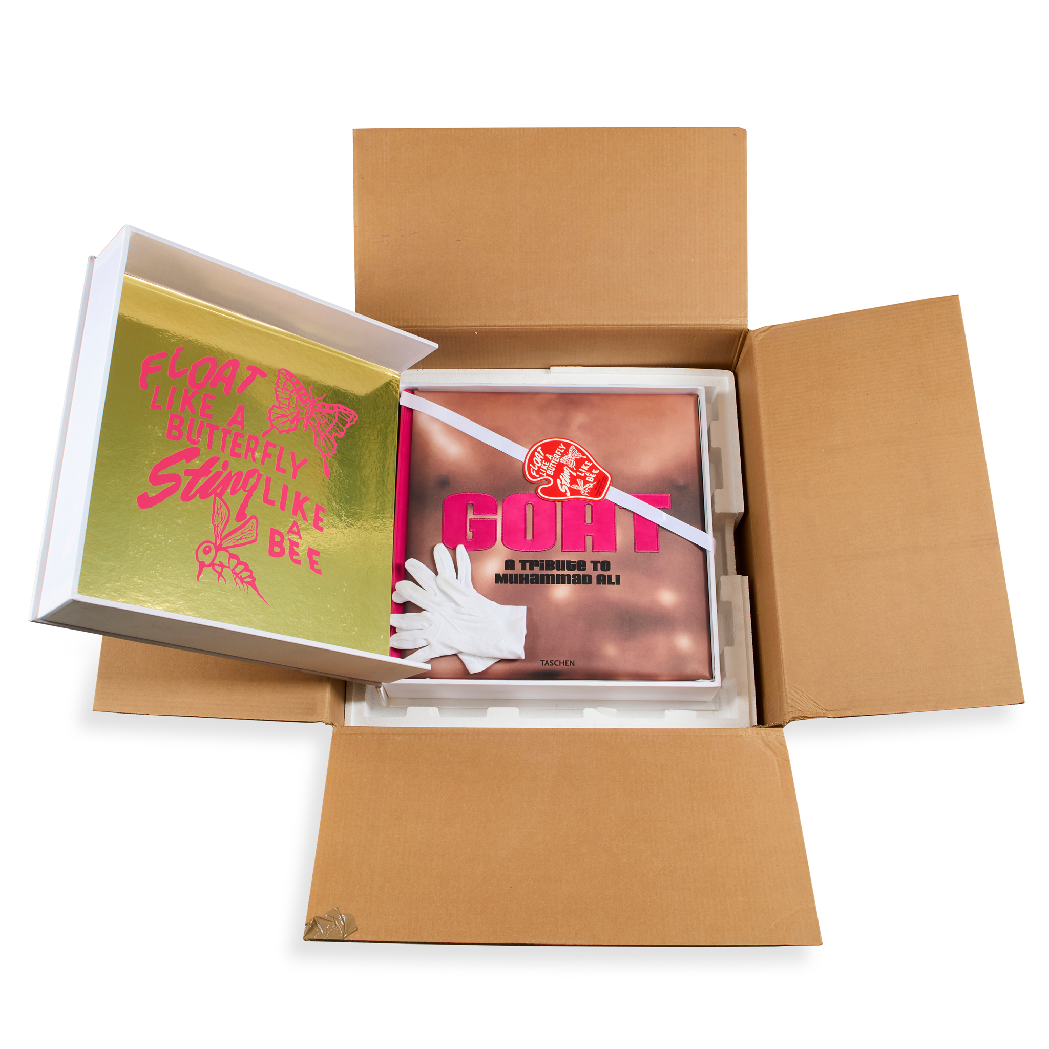 [Cologne:] Taschen, 2004. Collector's edition, one of 9,000 copies, signed by Muhammad Ali and Jeff Koons on translucent limitation leaf, large 4to, 49.5 x 49.5cm, original pictorial padded nylon covers, pink vinyl spine and similar appliqué title to front cover, colour photographic illustrations throughout, bound-in page-marker with card boxing glove attachment (slightly creased), original photographically-printed nylon solander box, with original photographic print (printed on verso: ‘This is one of 9000 prints by Jeff Koons for the collector's edition of G.O.A.T), pair of white cotton gloves, Taschen order form and printed handling instructions, all laid in, housed in original printed cardboard box with two polystyrene packing panels (slight damage)