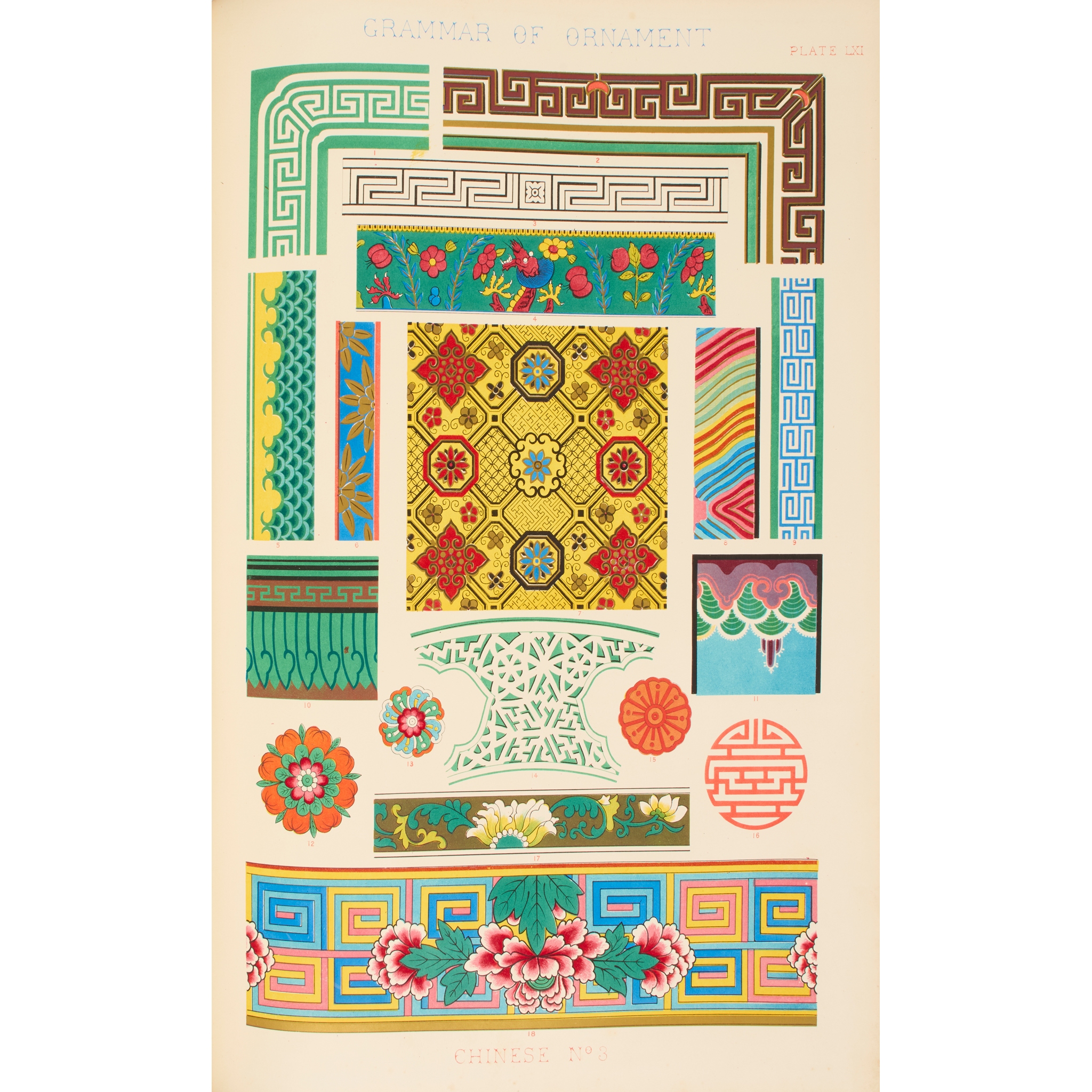 London: Day and Son, 1856. First edition, large folio (55 x 36cm), original half morocco gilt, rebacked with original spine laid down, large decorative gilt morocco panel to front board, chromolithographic additional title-page and 100 similar plates, many heightened in gilt, letterpress title-page printed in red and black, tissue-guards, rubbing to spine and extremities of binding, front joint partly cracked