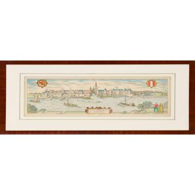Hand-coloured engraving from Civitates Orbis Terrarum by Georg Braun (text) and Frans Hogenberg (artist/engraver), a collection of mostly European maps, town plans and views published in 6 volumes in the late 16th century. 17.5 x 48.5cm, some wear to mid image from original book fold, mounted and glazed (36.5 x 67cm)