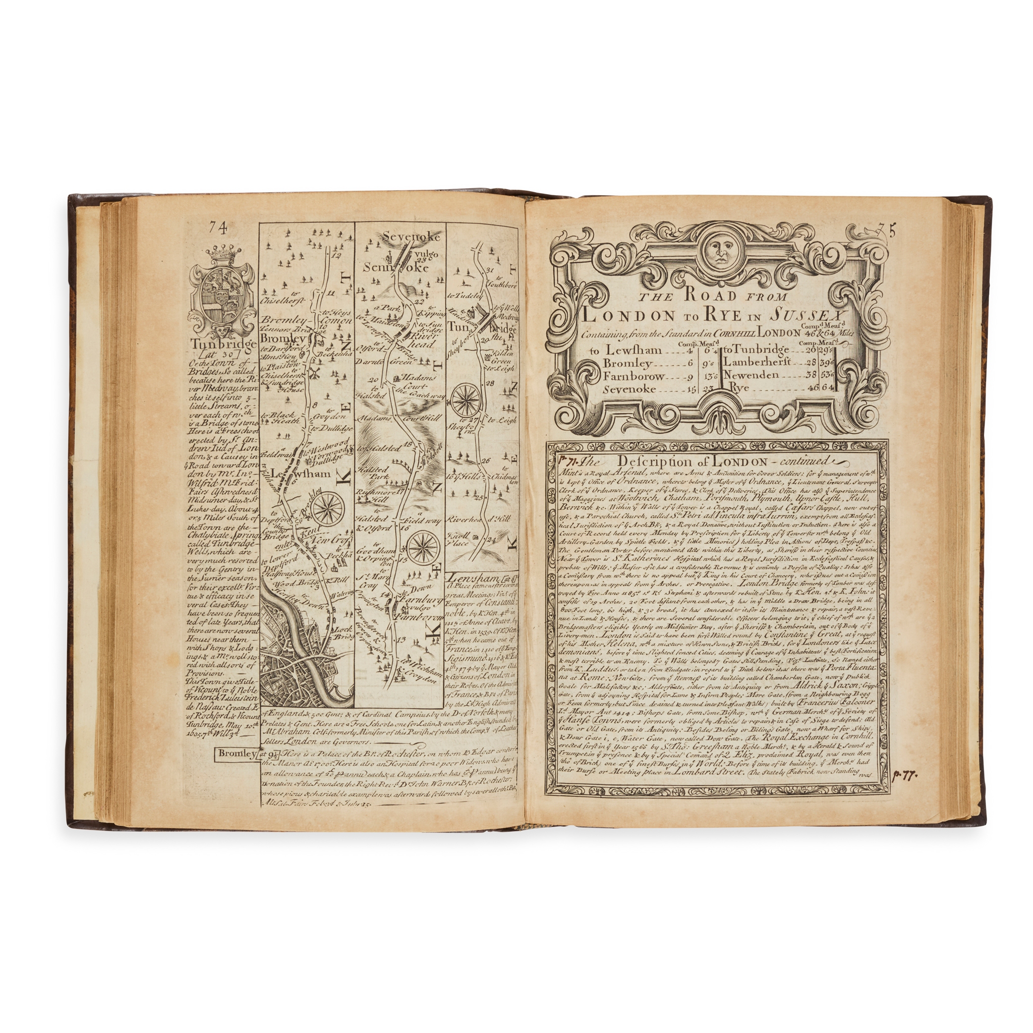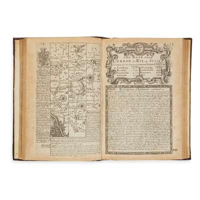 or Ogilby Improv'd. Being a Correct Coppy of Mr. Ogilby's Actual Survey of all ye Direct and Principal Cross Roads in England and Wales … Fourth Edition. London: Tho. Bowles, 1736. 4to (20.1 x 13.7cm), contemporary calf, rebacked and recornered, engraved title-page, 5 [3] pp. letterpress, 273 pp. engraved maps (road and county maps), toning, variable marginal browning. 19th-century ink annotations to rear blank [Chubb 153]
