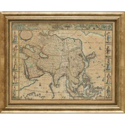 with the Islands adjoyning described, the Atire of the People, and Townes of Importance, all of them newly augmented. [London:] G. Humble, 1626. Hand-coloured engraved map (41.5 x 53cm), framed and glazed, with 8 vignette city views along top edge (Kandy, Goa, Damascus, Jerusalem, Hormuz, Banten, Aden and Macao) and 10 vignettes of local costume along left and right edges, browning, short closed tear to foot, repairs to lower corners on verso, frame crudely taped on reverse