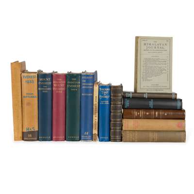 together with 12 others (these not fully collated, most with bookplates), including: Eric Shipton, Upon that Mountain, 1943 (second impression, original cloth, inscribed on front free endpaper in pencil ‘JH Norton, from EFN, 25/2/44, with MS review holograph by E F Norton', with said review laid in (a single foolscap sheet), Edward F. Norton being deputy leader of the 1924 Everest expedition and a member of the 1922 expedition); John Ball, Peaks, Passes, and Glaciers, 1859 (first edition, contemporary black half morocco); George Francklin Atkinson, Curry and Rice, c.1860 (second edition, recased, tinted lithographic plates); Fanny Bullock and William Hunter Workman, Ice-Bound Heights of the Mustagh, 1908 (first edition, original cloth); and similar (15)