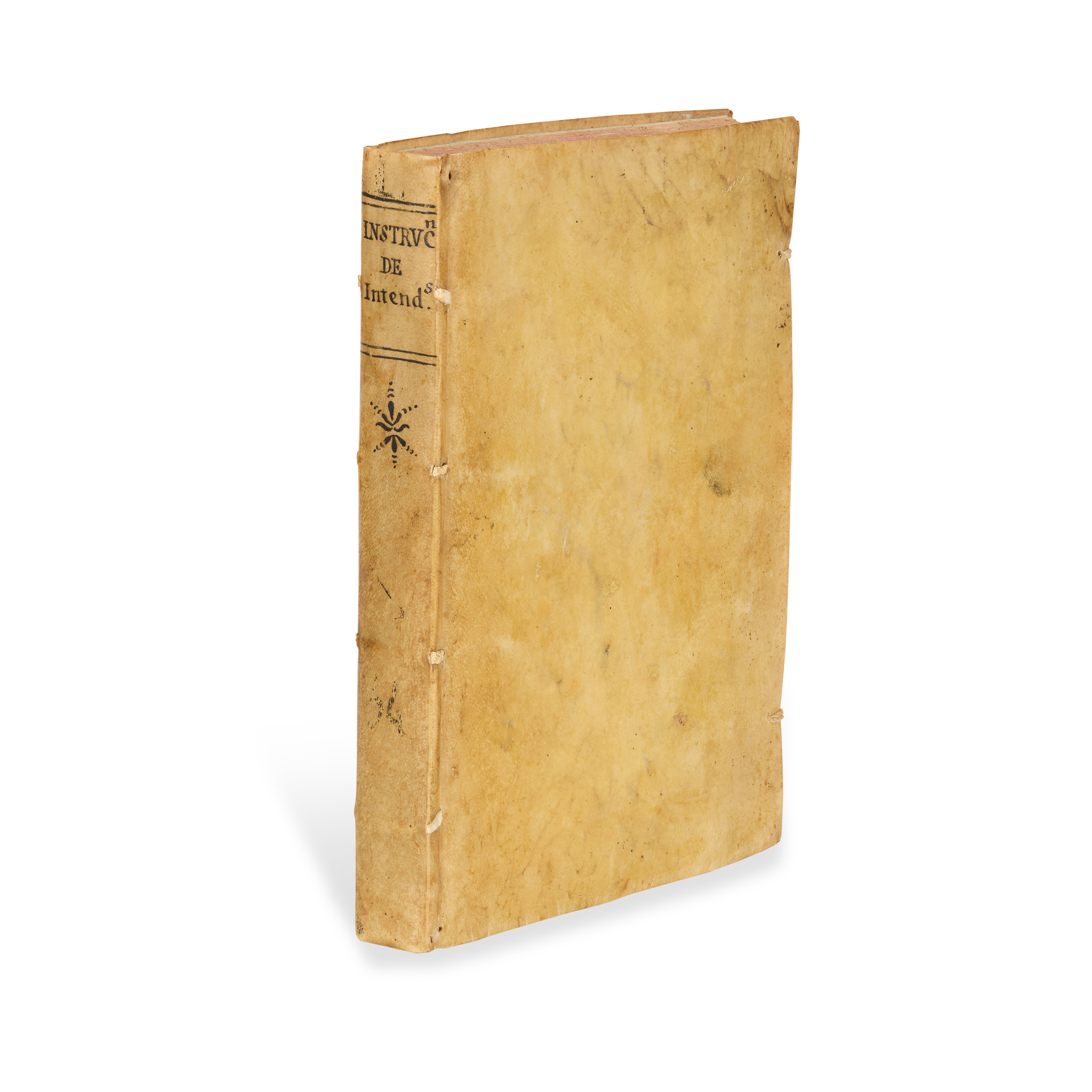 De orden de su Magestad [Part 2:] Leyes de la recopilacion de Indias. Madrid: imprenta Real, 1782. Folio (29.6 x 20.5cm), [62] 326 [140] [24] pp., sigs. pi-O2 P1 A-4M2 4N1 a-2l2 A-F2, contemporary limp vellum, manuscript spine-title and decoration, looped twine fasteners with vellum catches, edges sprinkled red, engraved arms at front (pi1), occasional manuscript marginalia, 3 related manuscript documents bound in at rear, respectively 10, 2, and 1 pp. dated Manila, 1785-6-7, each written in a secretarial hand, the first two signed at foot ‘Gonzalez’, the third signed ‘Ciriaco Gonzalez de Carvajal’ (see note), second part sigs. G-2K with variable worming in gutter, ramifying up to about sig. 2A then receding, occasionally touching text to minimal effect on legibility, a few old paper repairs [Palau 202982]