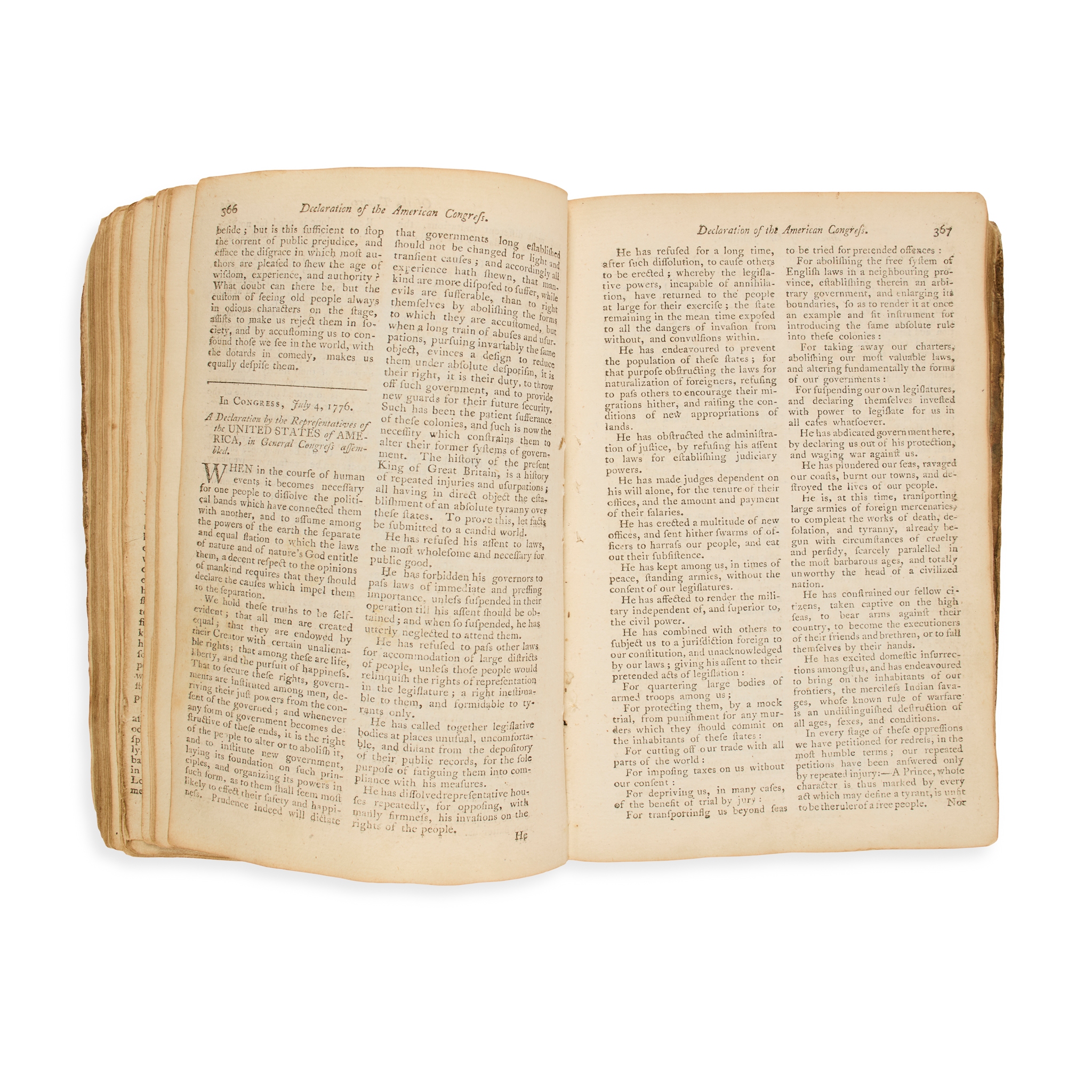 London: for G. Allen, 1776. 12 monthly numbers in 1 volume, 8vo, 3-584 pp., contemporary quarter calf, with the Declaration of Independence printed at pp. 366-8, 8 engraved plates (including ‘The State Blacksmiths Forging fetters for the Americans'), front board detached, lacking title-pages for January and August-December (where issued), also lacking at least 6 plates (i.e. 2 plates from each of April, May and June as mentioned on the respective title-pages), closed tear to pp. 289/90, damp-staining to final few leaves, sold with all faults
