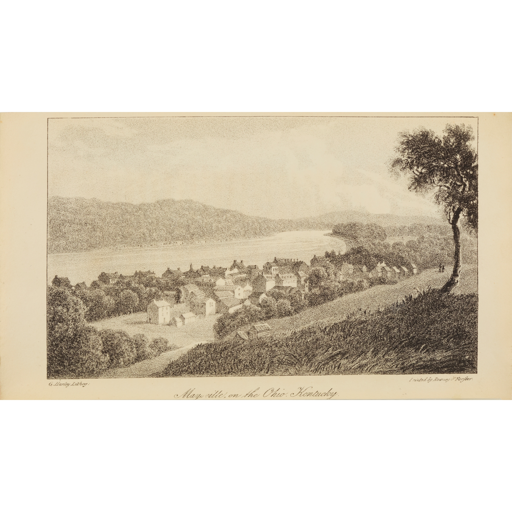 with a Winter Residence at Philadelphia. Solely to ascertain the Actual Prospects of the Emigrating Agriculturist, Mechanic, and Commercial Speculator. London: for J. Drury, 1821. First edition, 8vo (21.5 x 12.5cm), [iii]-xii 224 pp., later patterned boards, 14 tinted lithographic plates including frontispiece, tissue-guards, errata slip incorporating directions to the binder bound in at rear, plate intended to face p. 40 ('Place of Worship …') bound to face p. 72 and with stain in fore margin, ‘The Church at Harmonie’ plate at p. 129 slightly spotted , final plate ('View at Fort Cumberland, Maryland') and unevenly trimmed along fore edge and bound without tissue-guard (if issued), pp. 79/80 creased, short closed tear to errata slip in gutter [Sabin 102514; not in Abbey]