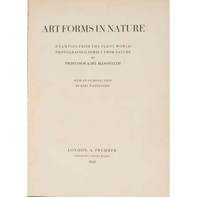 Art forms in nature: examples from the plant world photographed direct from nature by Professor Karl Blossfeldt; with an introduction by Karl Nieren Dorf. London: A. Zwemmer, 1929. First English edition, 4to,120 photogravure plates, original green cloth;