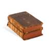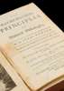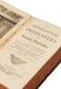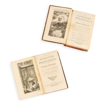 Translated into English by Andrew Motte. To which are added, The Laws of the Moon's Motion, according to Gravity. BY John Machin. London: for Benjamin Motte, 1729. 2 volumes, 8vo (19.2 x 11.6cm), contemporary calf, [36] 320, 393 [13] viii [3] 4-71 [1] pp., sigs. pi1 A2 ²A8 a8 B-X8, A-2D4 (-2D4, cancelled) a4 ²A-²D8 ²E4, engraved allegorical frontispiece to each volume, 47 engraved folding plates (numbered 1-25 and 1-19, with 3 unnumbered plates at rear of volume 2), 2 folding letterpress tables, 3 engraved headpieces. Bindings rebacked probably in the 19th century with endpapers renewed, worn overall, volume 1 rear board and volume 2 front board detached, intact joints cracked, occasional light spotting to margins, title-pages slightly spotted, volume 1 title-page with patch of browning in gutter and with faint crease across lower fore corner, small tear to head of D7, closed tear in I8, volume 2 title-page with a longitudinal strip of slight paper-thinning, one unnumbered plate at rear with creasing to fore margin and small nick to top margin [Babson 20; Wallis 23; cf. PMM 161]
