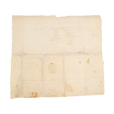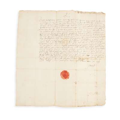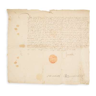 Exemption from service, dated 26th August 1583, due to illness, signed James R., and countersigned twice including R. Dunfermline, with remnants of wax seal, 21 lines on paper, 28.5 x 26cm; Exemption from service, dated 20th October 1588, due to illness, signed James R., with red wax seal, and countersigned by another, 23 lines on paper, 31 x 33.5cm [Rose, Shaw & Innes p.271]