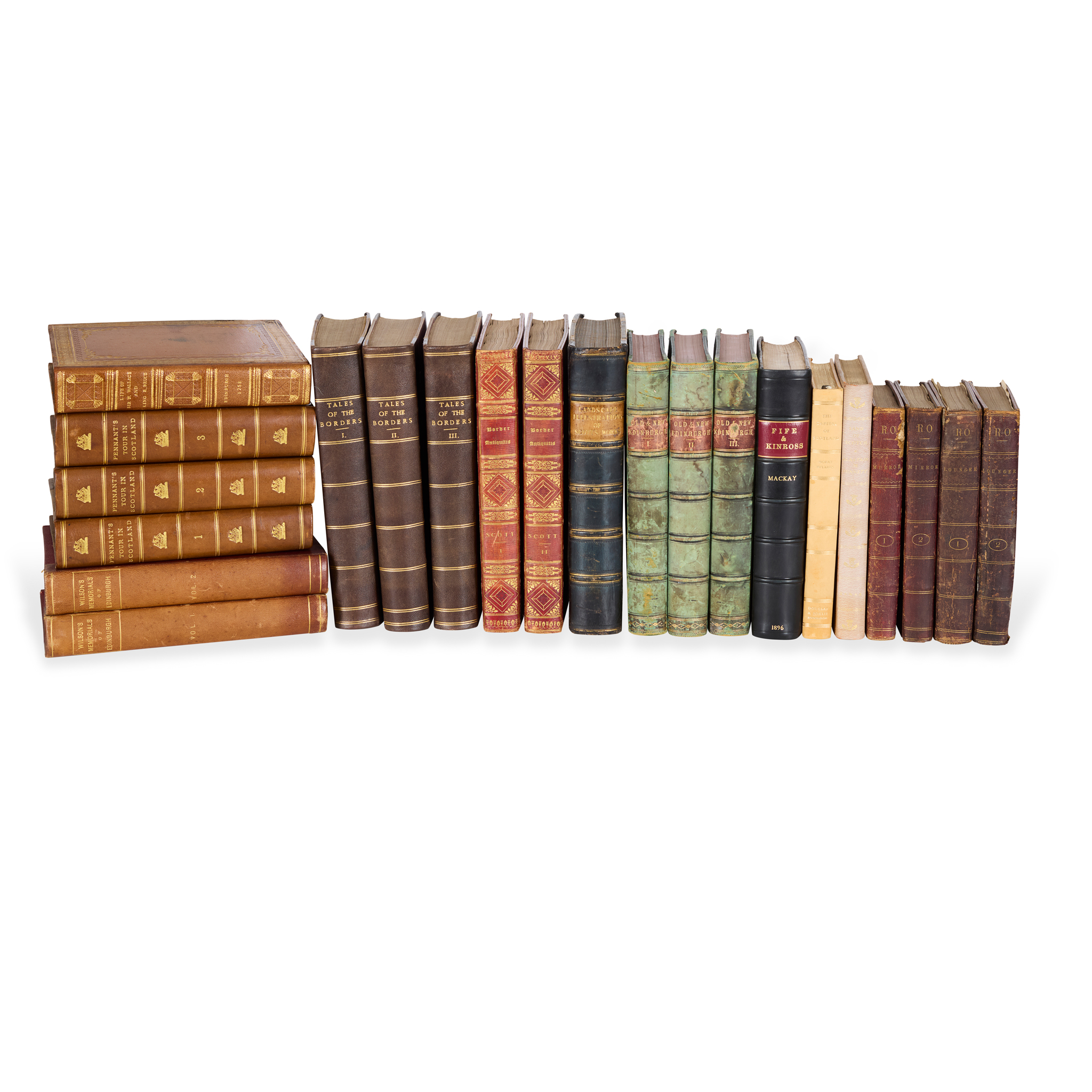 and 11 others, Scottish topography and history (these not collated), including: Walter Scott, The Border Antiquities of England and Scotland, 1814 (first edition, 2 volumes, 4to, contemporary straight-grain morocco richly gilt); Wilson's Historical, Traditionary, and Imaginative Tales of the Borders, and of Scotland, Newcastle: Adam & Co., c.1880 (3 volumes, 4to, near-contemporary purple half morocco, lithographic plates); and similar (22)