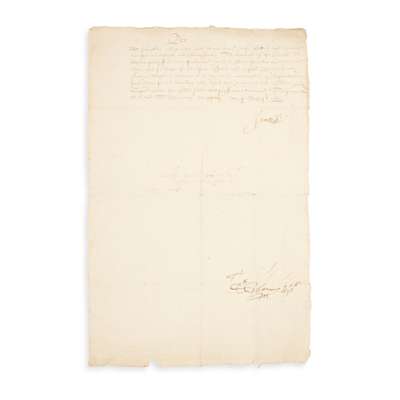 A special warrant from the King to the Privy Council, dated 24th August 1603, liberating the XI Baron of Kilravock and his son from prison in Edinburgh, where they had been interred for failing to apprehend rebellious kinsmen: “We haif gevin and grautit and be the tennour heirof gevis and grantis our speciall licence and permissioun to Williame Ros of Kilraik, to depart furth of our burcht of Edinburcht, quhairin he is presentlie wardit, home to his awin hous, for doing of his lefull efl'airis and business, without ony scaithe or danger to be incurrit be him...”, signed James R., and countersigned Sir G. Howme Thesr., 8 lines on paper, 19.5 x 30.5cm [Rose, Shaw & Innes p.293]