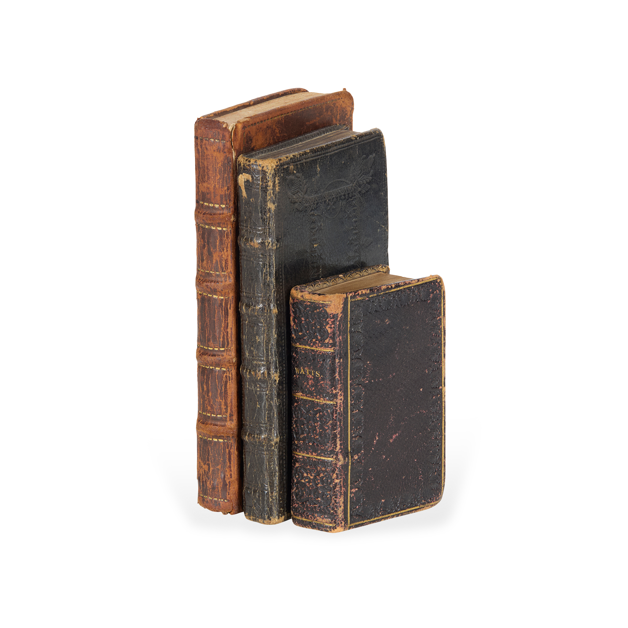 Gorinchem: Helmich and Johannes van Cappel, 1671. Small 8vo (11.7 x 6cm), unpaginated, signatures A-Q8 P4, contemporary English ‘Sombre binding’ of black morocco, flower and seed-head devices in blind to spine-compartments, decorative blind panels to covers incorporating acorn cornerpieces, five-pointed star devices and various rolls, edges dyed black, marbled endpapers, bound with a Catechismus at rear (12 leaves, in a separate register, starting at 4K), early engraved armorial bookplate of George Carre, advocate to front pastedown;
