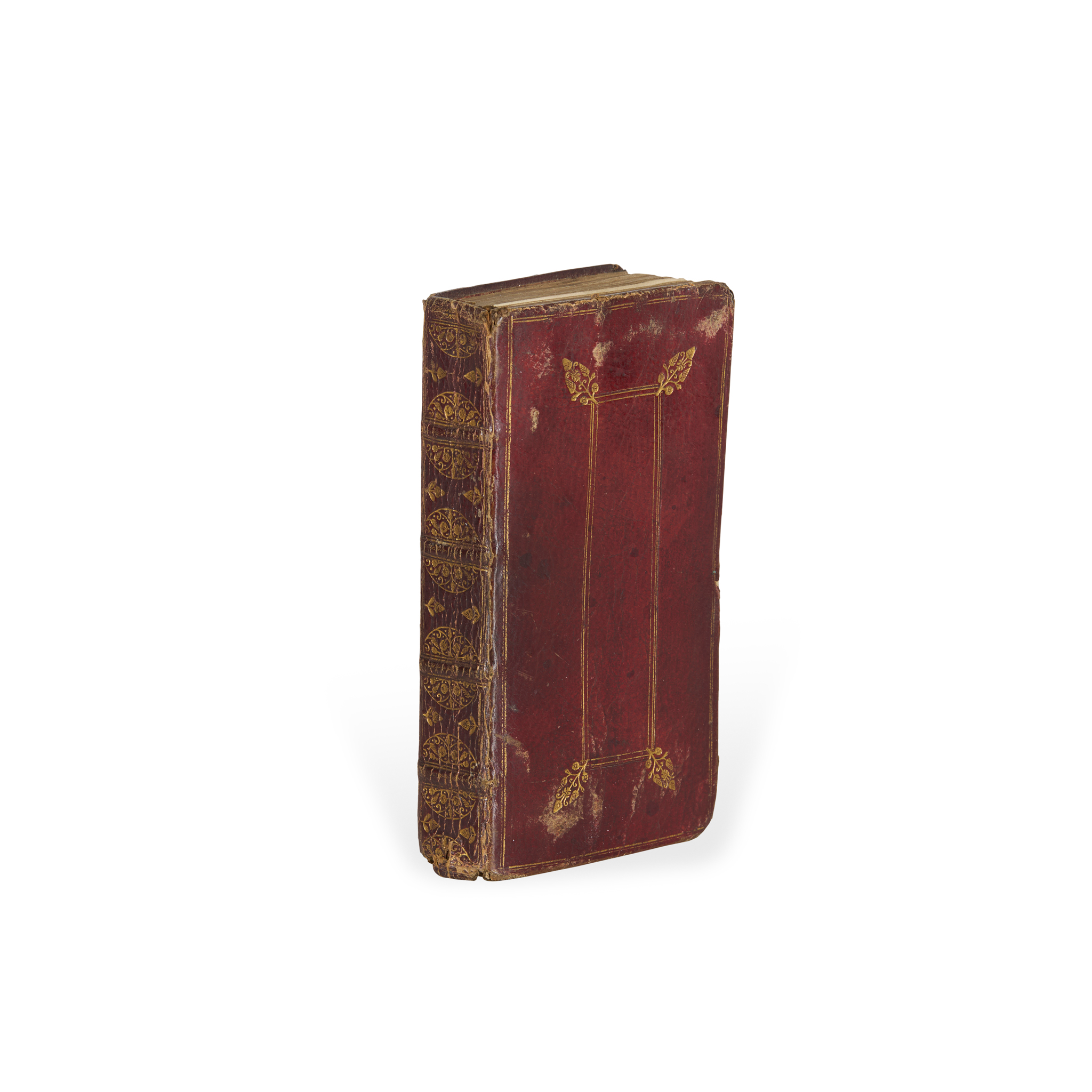 Oxford: printed at the Theatre, and are to be sold by Thomas Guy, 1684. 12mo (13.5 x 7cm), contemporary red morocco, spine richly gilt in compartments, decorative panels and floral cornerpieces to covers, marbled endpapers, all edges gilt, engraved portrait frontispiece of James II, 44 engraved plates including New Testament scenes and portraits of saints, lacking leaf F12, also lacking N10-12 but these apparently cancelled and the text continuous, a few small tears