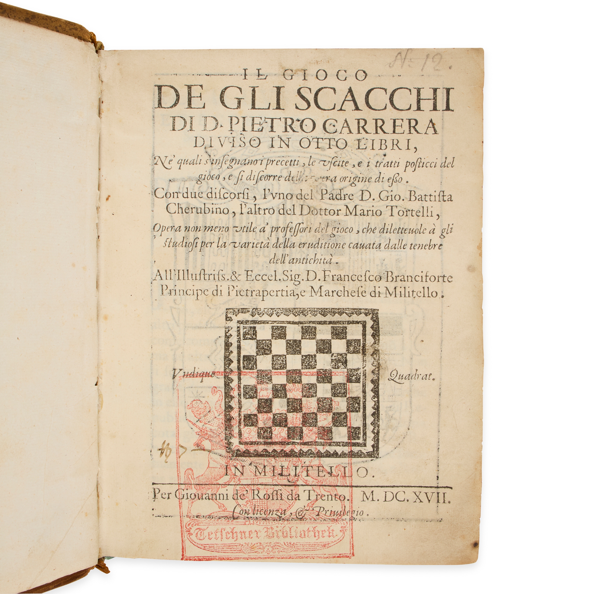 First edition of a rare and early treatise on chess, incidentally the first work printed in the Sicilian town of Militello ('primera opera stampata a Militello', Treccani), though it has been suggested that it was preceded by another work, now unprocurable: ‘In 1617, Prince Francesco Branciforti, marchese of Militello, with the assistance of Father Pietro Carrera … established at his own expense, in his palace at Militello, a private printing press run by Giovanni de’ Rossi de Trento … The press was closed in 1623 after the prince’s death: eight books were published by his press, of which the oldest is a treatise of Prince Branciforti in Spanish titled De amore honesto: it cannot be found today. Let us also note Carrera’s rare and curious book, Il gioco degli scacchi’ (Fumagalli, Lexicon Typographicum Italiae, 1905, pp. 232-3). One interesting feature of the book is Carrera’s proposal of a new 10 x 8 board (illustrated on p. 531).