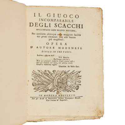 suiluppato con nuovo metodo, per condurre chiunque colla maggiore facilita dai primi elementi fino alle finezze piu magistrali. Modena: eredi di Bartolomeo Soliani, 1769. First edition, 4to, viii 383 [1] pp., later vellum, edges untrimmed, woodcut head- and tailpieces and initials, occasional spotting and staining [Lind, Das erste Jahrtausend der Schachlitteratur (850 - 1880), 2052]