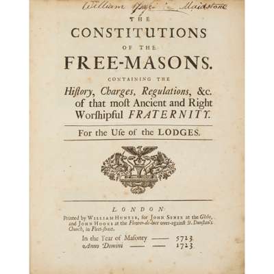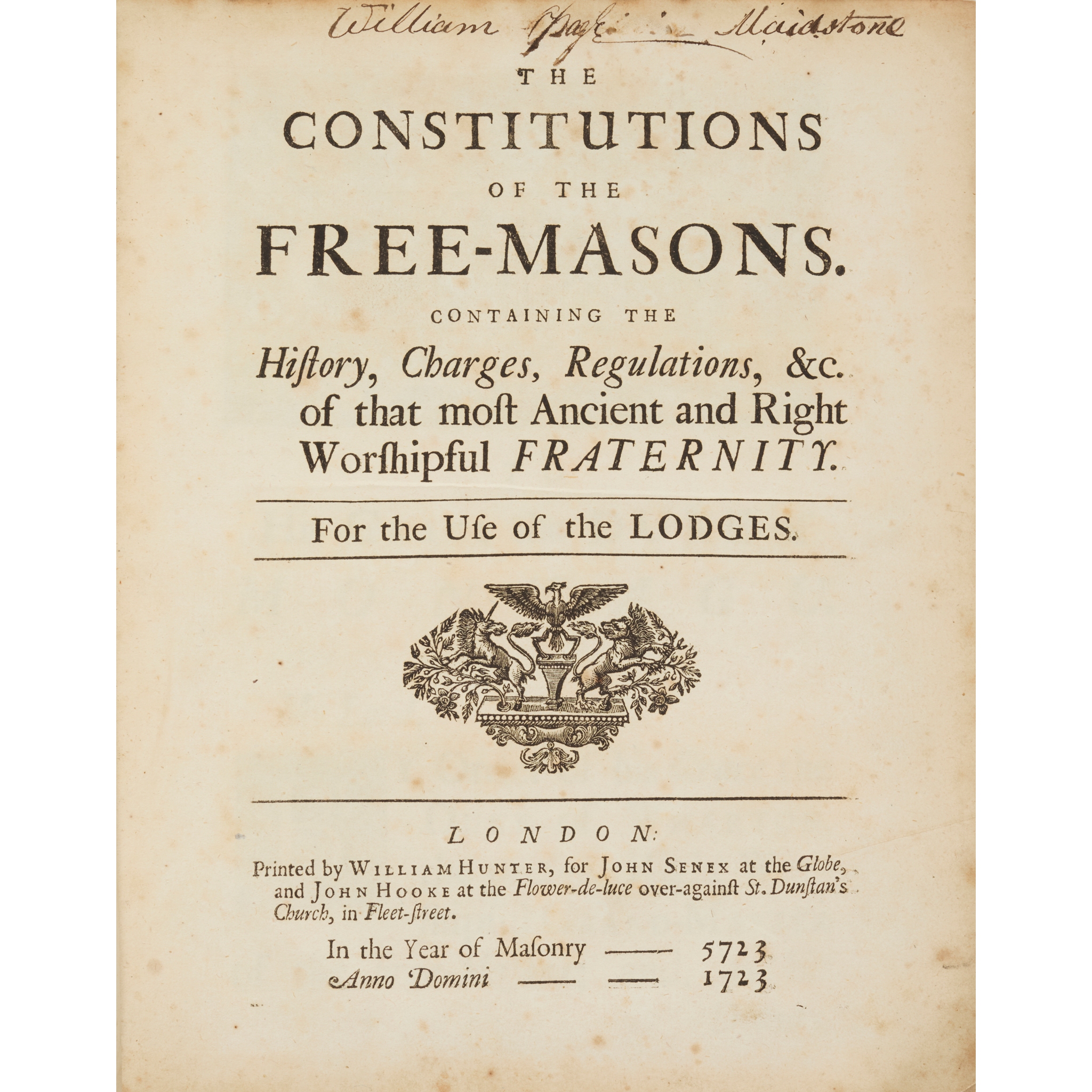 Rare. Published six years after the foundation of the first Grand Lodge in England, the work was reprinted in Philadelphia in 1734 under the auspices of Benjamin Franklin, becoming the first masonic book printed in America: Franklin's edition has recently been described as ‘the seminal work of American Masonry, edited and published by one of the founding fathers, and of great importance to the development of colonial society and the formation of the Republic' (Paul Royster, ‘The Constitutions of the Free-Masons (1734): An Online Electronic Edition’, UNL Libraries: Faculty Publications, no. 25, 2008).