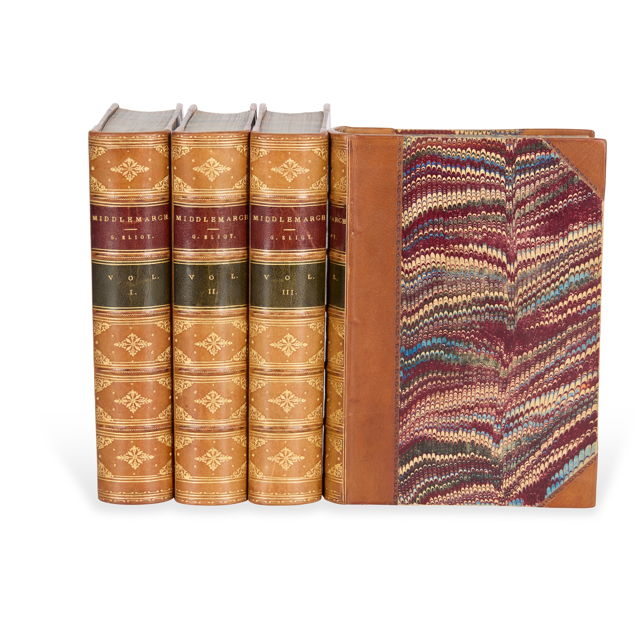 Edinburgh: William Blackwood and Sons, 1871-2. First edition, 4 volumes, 8vo (17 x 11cm), [7] vi-vii [4] 2-410, [9] 4-377, [9] 4-384, [9] 4-371 pp., light brown half calf, gilt-decorated spines with red and green labels, comb-marbled sides, endpapers and edges, half-title to each volume, errata slip to volume 2, advertisements discarded, spotting to endpapers, blanks and outer leaves, volume 2 with repair to gutter of pp. 96-7, volume 4 pp. 173/4 with marginal loss [Sadleir 815] (4)
