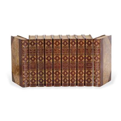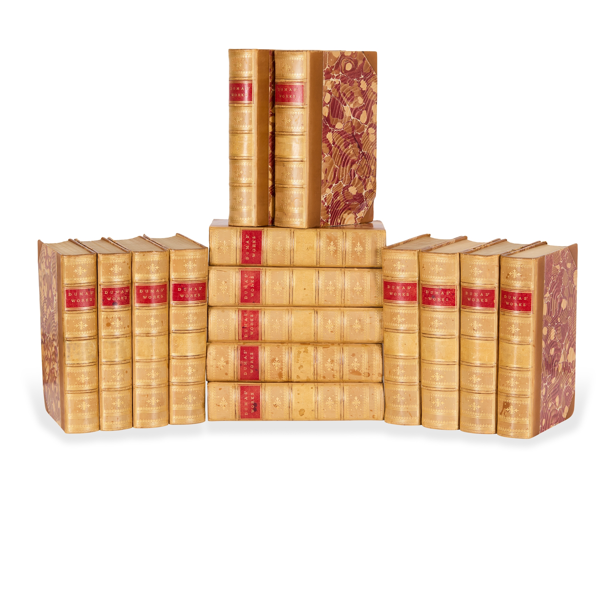 Dumas, Alexandre. [The Works]. Boston: Dana Estes & Company, c.1900. ‘Illustrated Sterling Edition’, 15 volumes, 8vo (19.8 x 12cm), contemporary tan half calf, spines lettered and decorated in gilt, marbled sides, top edges gilt, frontispieces and plates, bookplates (Louis E. Goodman);