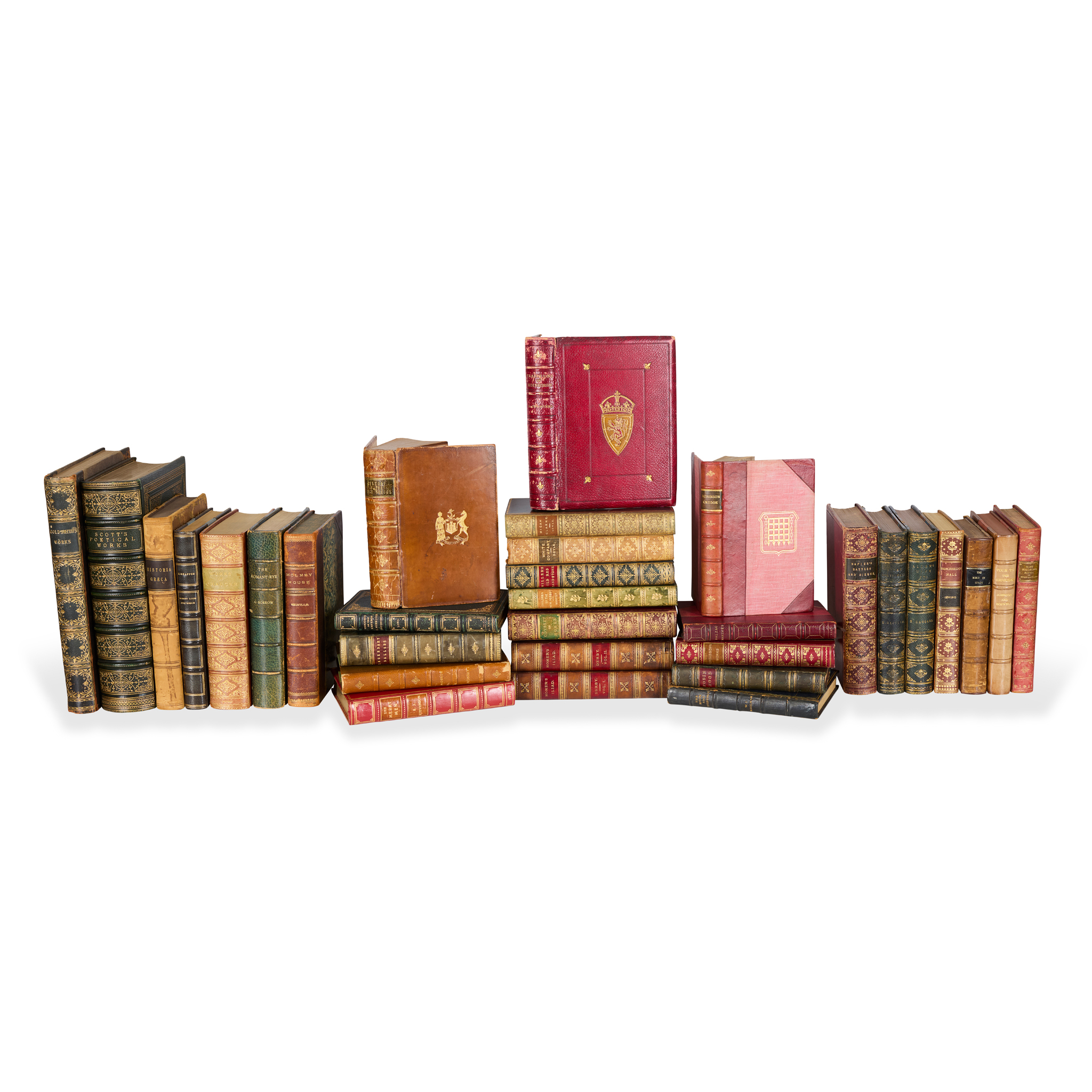 30 in total, nearly all 8vo, including: Robert Louis Stevenson, The Merry Men and Other Tales and Fables, London: Chatto & Windus, 1887 (first edition, 20th-century red calf gilt by Bayntun (Riviere), all edges gilt); Arthur Conan Doyle, Micah Clarke, 1898 (contemporary prize-binding of green calf gilt), and The White Company, 1913 (contemporary prize-binding of tan calf gilt); H. Rider Haggard, Allan Quatermain, 1887 (first edition, contemporary blue-green half morocco, spine rubbed, Chesterfield House bookplate), Allan's Wife and Other Tales, 1889 (binding uniform with the preceding work, Chesterfield House bookplate), and King Solomon's Mines c.1900 (reprint, contemporary red calf, prize inscription to initial blank); Robin Hood: a Collection of All the Ancient Poems, Songs, and Ballads, now Extant, relating to the Celebrated English Outlaw, London: for Longman [etc.], 1820 (contemporary half calf); and similar, including Chaucer, Borrow, Johnson and Boswell and Maugham (30)