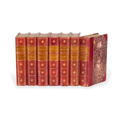 Brontë, Charlotte, Emily & Anne. The Life and Works of Charlotte Brontë and her Sisters. London: Smith, Elder, & Co., 1899. ‘Haworth Edition’, 7 volumes, 8vo (19.4 x 12.5cm), contemporary red half calf by Mudie, half-titles, frontispieces and plates, contemporary gift inscriptions to initial blanks, rubbing to extremities, Life of Charlotte Brontë headcap worn, spotting to outer leaves;