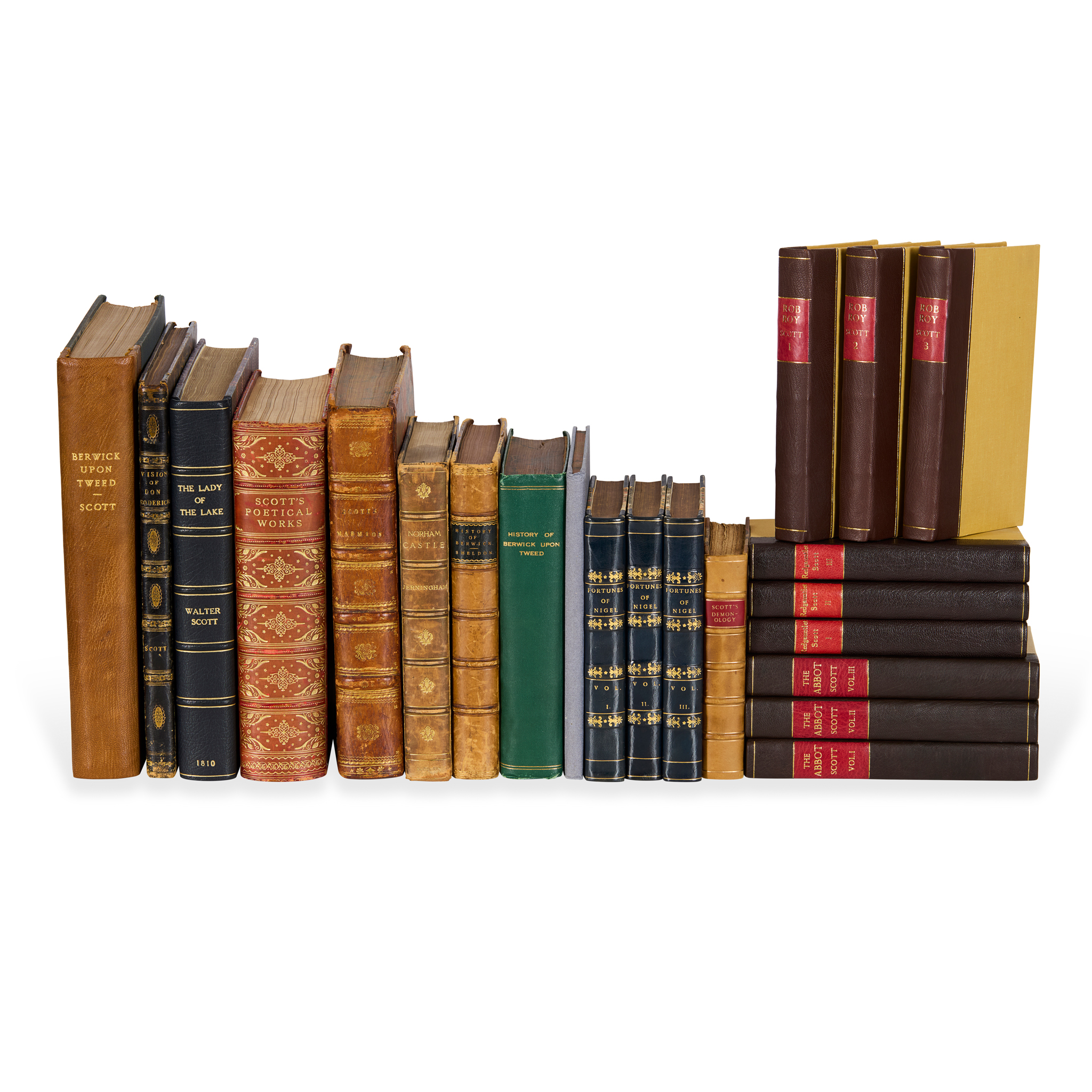 Together with 14 others (these not collated), nearly all Walter Scott first editions (The Lady of the Lake, 1810, 4to, modern quarter morocco; The Vision of Don Roderick, 1811, 4to, contemporary black half morocco; The Fortunes of Nigel, 3 volumes, 8vo, modern blue half calf; and similar) or antiquarian works on Berwick-upon-Tweed (23)