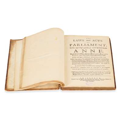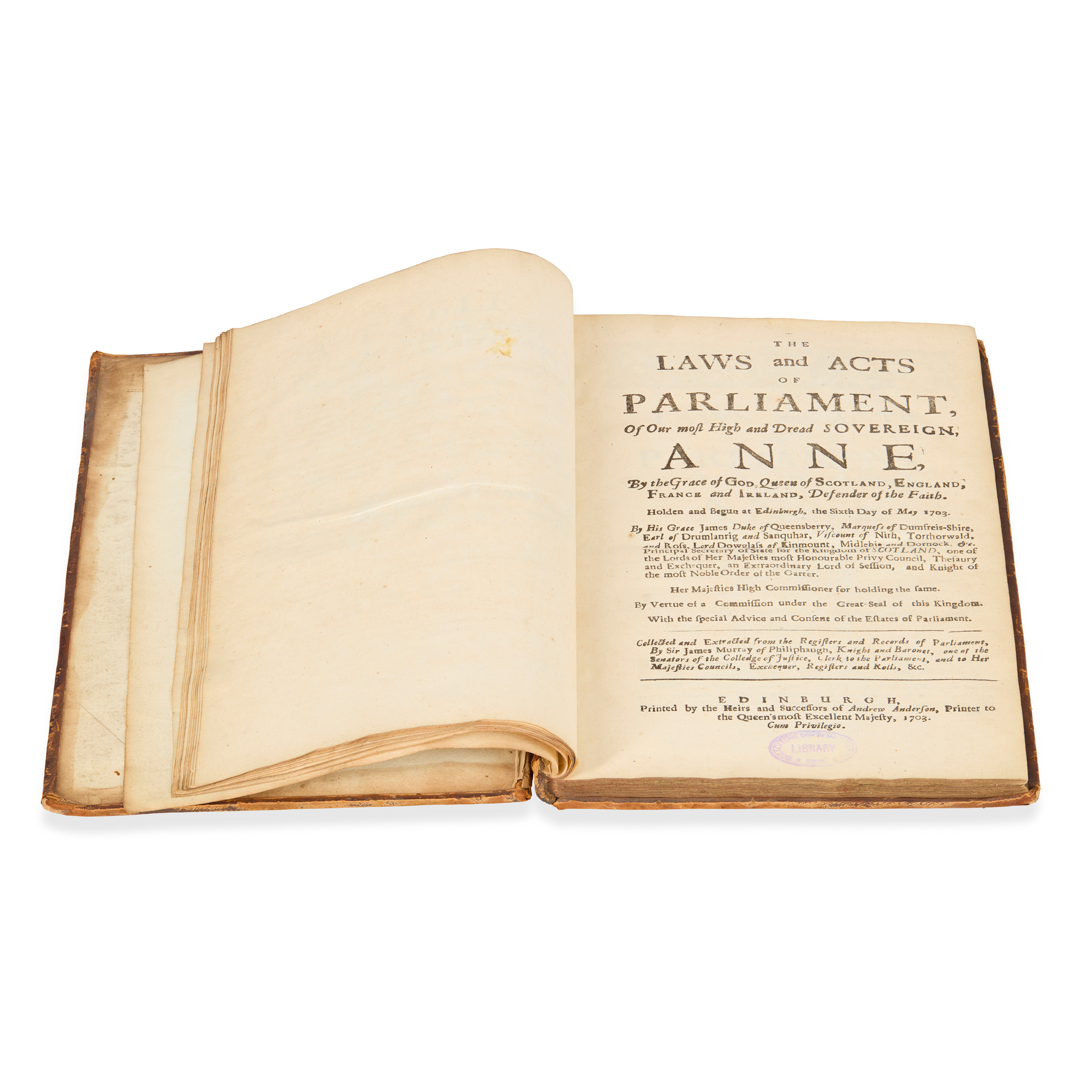 The Laws and Acts of Parliament of Our most High and Dread Soveraign Anne. Edinburgh: Printed by the Heirs and Successors of Andrew Anderson, 1702. 4to, covering June; [bound with] The Laws and Acts of Parliament of Our most High and Dread Soveraign Anne. Printed by the Heirs and Successors of Andrew Anderson, 1703. 4to, covering September 1703, possibly with facsimile title-page and initial leaf, and including a copy of: The Declaration of the Estates of the Kingdom of Scotland, containing the Claim of Right and Offer of the Crown to their Majesties King William and Queen Mary, April 1689; thereafter containing The Laws and Acts of Parliament of Our most High and Dread Soveraign Anne for 1704, 1705, 1707 [begun 3rd October 1706], the latter containing Act Ratifying and Approving the Treaty of Union of the Two Kingdoms of Scotland and England, January 16, 1707; contemporary calf, upper cover detached;