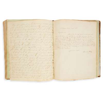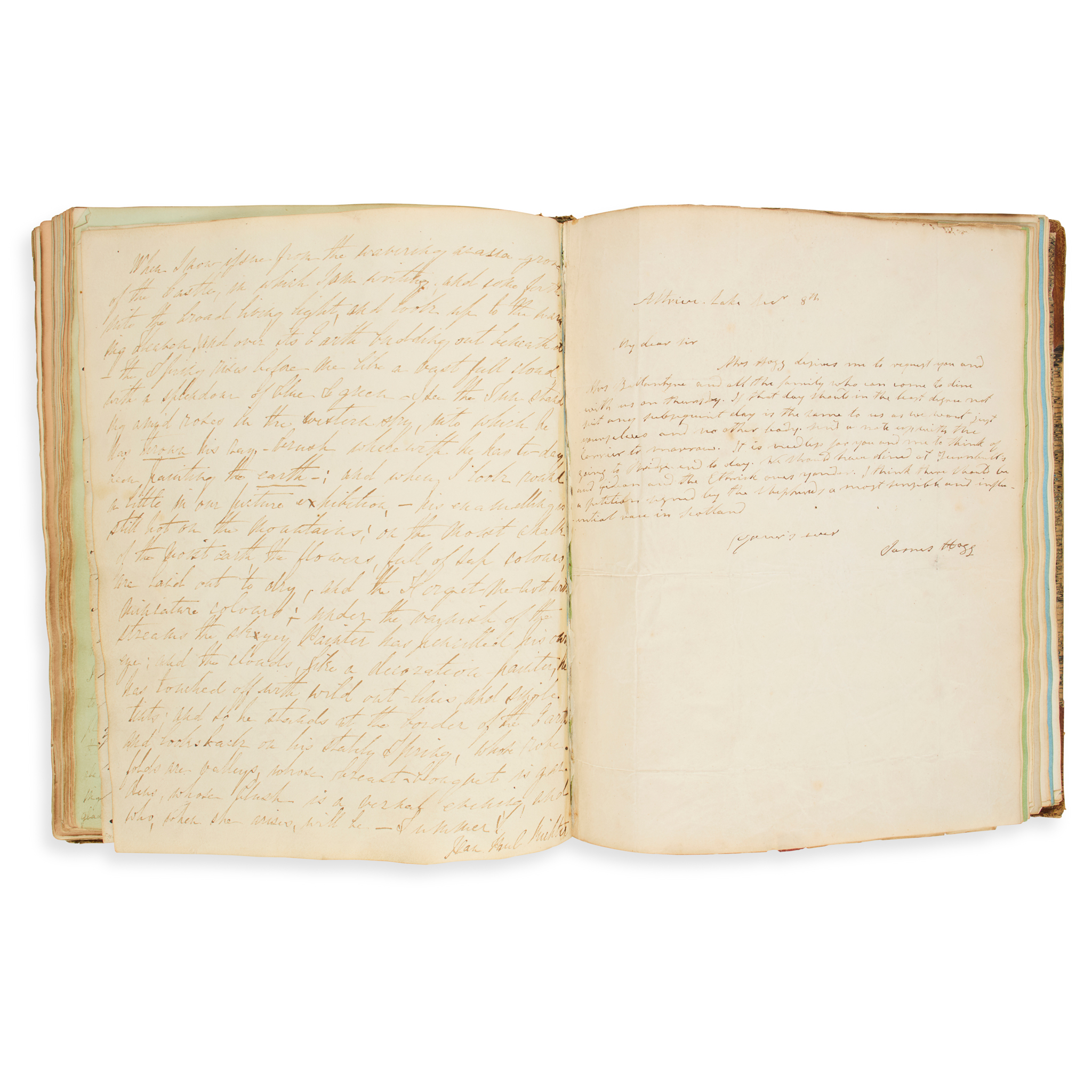 With manuscript verses and prose copied from Jean Paul Richter, Robert Gilfillan, Charles Lamb, Shakespeare, Walter Scott (Lay of the Last Minstrel with a pencil sketch signed Robt. Martin), and William Wordsworth ("The Ettrick Shepherd", written on learning of James Hogg's death), including a seemingly original poem by an unknown writer “Lines on Newark Castle” signed Yarrow Manse 1836, a loosely inserted letter: “My dear Friend, On the banks of Yarrow, where your home is, I leave you these lines as a long remembrance…, With esteem and true friendship, yours sincerely, ?? Clement of Denmark”, and a bound in letter signed James Hogg, to Robert Ballantyne Esq. [husband of Katharine and father of Margaret], one leaf with the faint pencil signature of Margaret L. Hogg, in 19th century half calf album, 23.5 x 19cm, covers detached