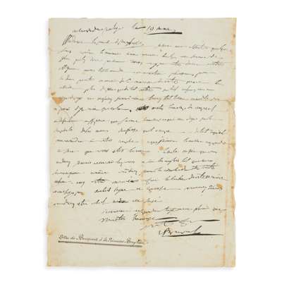 Addressed to his sister, Princess Pauline Borghese, dated “au Camp du Boulogne” 19th November [1803], one leaf 25 x 19cm, in which Napoleon encourages his younger sister to settle in to her marriage to his friend, Prince Camillo Borghese, offering advice and instructions: “Distinguish yourself by your gentleness, your kindness to everyone, and your extreme thoughtfulness to the ladies who are relatives and friends of your husband's household. Conform to the customs of the country, never despise anything” and “The only nation you must never receive in your home is the English as long as we are at war, and you must never even admit them into your intimate society”, previously folded, a little foxing and a couple of repairs to the reverse