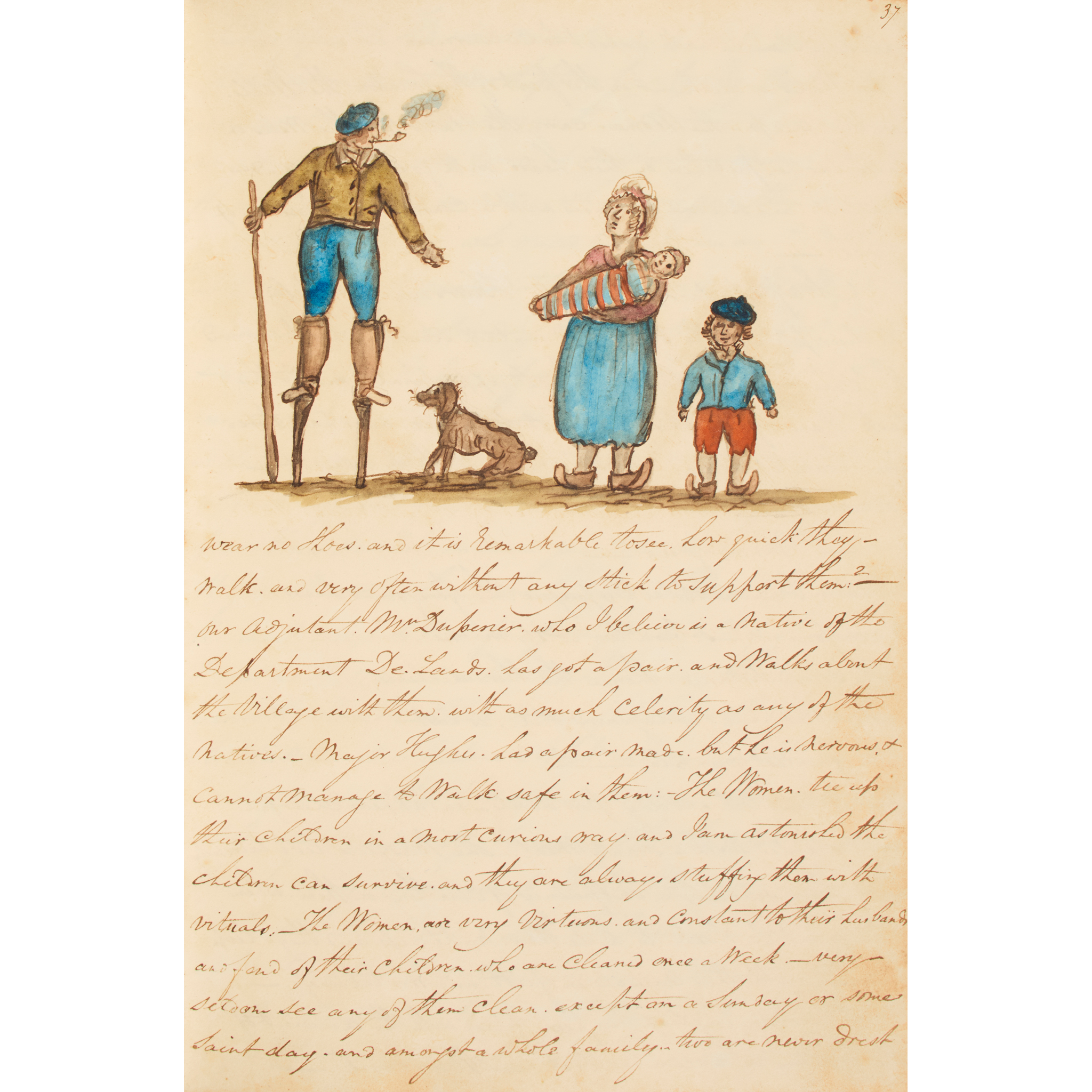 Two manuscript journals beginning on the 18th January 1813 and finishing on the 16th July 1815, comprising 436 manuscript pages about Lieutenant George Woodberry's experiences in the 18th Hussars, including a detailed three-and-a-half page description of the Battle of Waterloo, volume 2 including hand-drawn and coloured illustrations of a Basque man and woman, and a family in Chapel de Haspare, the neatness and absence of erasures in these journals means that it is possible they are copies of original notes made in the field, each bound in diced calf, 16 x 24cm, volume 1 pp.107-8 has a small tear with loss to a few words, Mid-September – December 1813 do not seem to be included but a large number of blank leaves are present in place of these dates, in volume 2 pp.41-42 (13th-14th February 1814) has been cut out, pp.135-6 are missing, and pp.225-6 damaged with lower section torn, no loss to text (2)