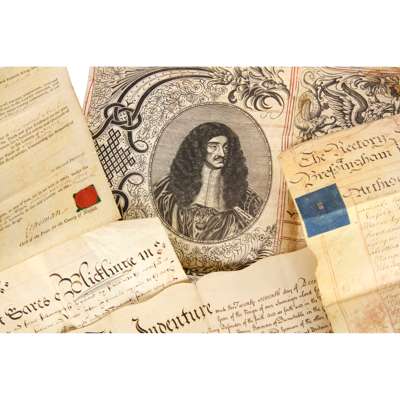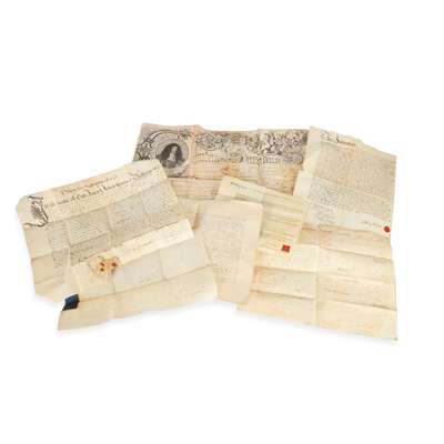 Including: [Highwaymen], document ordering the payment of bounty for the capture of James Mooney ‘for feloniously assaulting on the king's highway at Portsmouth and robbing Elizabeth Cartwright widow of seven shillings and six pence', 1764, on vellum, signed by Joseph Yates (1722-1770), judge, and others, window-mounted; Simon Fraser, 11th Lord Lovat (c.1667-1747), leader of the 1745 Jacobite Rebellion, warrant for payment ‘of such His Majesties Treasure as remains in your charge unto Simon Lovat or his assigns the sum of one hundred pounds without account for one quarter of a year …', 1738, subscribed ‘My Ld Macclesfield I pray pay this order out of duty on houses’, signed at foot ‘Winnington’, 'G Earle' etc.; John Potter (1674-1747), archbishop of Canterbury, letter signed as bishop of Oxford, 1718, probably autograph, on complaints of neglect from the parishioners of Stanton Harcourt; Thomas Secker (1693-1768), archbishop of Canterbury, autograph letter signed as bishop of Oxford, 1749, on vicarages in the parish of Churchill (tape-repairs at foot); [Glorious Revolution], ‘The preparation of the Happy Coronation of King William and Queen Mary, 5 November 1724, an early manuscript copy of the celebratory anthem published in broadside form as The Court of England [etc.], with added introduction to head and another song on conjugate leaf; [East India Company], indenture dated 1797 mentioning ‘Charles Stokes of Calcutta in the province of Bengal in the East Indies’, possibly lacking conjugate leaf; Charles II, chancery document on vellum with large engraved portrait and headpiece, rubbed and stained; attributed to Peter Canisius (1521-1578), Dutch Jesuit priest and saint, clipped inscription ‘Approbat a R. P. Canisio 1578’, possibly autograph, affixed to album leaf via red wax seal; Joseph, bishop of Soissons, document signed, 1726; and approx. 40 others, mainly deeds and indentures on vellum (a few on paper), 17th-18th century, some 19th century, most relating to Norfolk (all for parishes starting with the letter B, e.g. Brumstead, Broome, Blickling, Bressingham, Brancaster, Brandon, etc.), other items including an indenture signed by Lord Ossulston, 1714, receipt signed by Lord Masham, 1712, etc. (approx. 50)