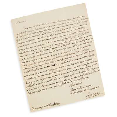 Written to Frans Hermsterhuis, referring to his son's experiments "il est actuellement occupé à faire achever l'impression déja assez avancée sur l'électricité, matiere dans laquelle il se flatte d'avoir fait quelques découvertes intéressantes et utiles", thanking his correspondent for four copies of his "Aristée" "je n'ose pas, après une seule lecture bien rapide de votre nouvel ouvrage, hazarder mon suffrage sur un sujet si abstrait et si difficile", preferring to await the arrival of his "Simon", 1 page, Chevening, 27th December 1779