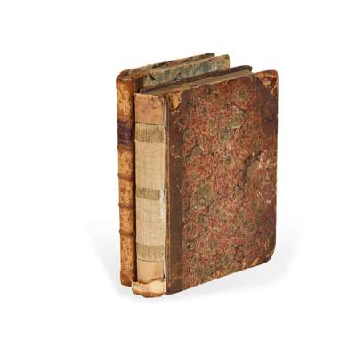 8vo (21 x 13cm), [2] 74, [2] 65 pp., written in ‘tête-beche’ format with female cases at front and male at rear, each section starting with index on the relevant endpaper with headings ‘Age’, ‘Name, 'Diseases' and ‘Event’ (i.e. outcome), with each case being divided into daily reports, front free endpaper with title ‘Vol. 5., Clinical Reports, Dr Rutherford. From February 1st to April 1796’ on recto, bookplate of William Woolcombe M.D. to front pastedown, bound in contemporary calf-backed marbled boards with vellum tips, spine label (with minor loss) reading ‘Clinical Reports Rutherford’; together with another manuscript (4to, 268 pp., containing two works: ‘Essay on the Physiology of the Nervous Sister by R Wisemann, surgeon, Cupar, read before the society Jan 12th 1827’, and ‘Essay on Paralysis read befor the Society 5 July 1827 by Alexr Reid, surgeon, Markinch’, later pencilled annotation to endpaper identifying work as ‘Essays of the Fife Med. Chirurgical Society Vol. II 1827’) (2)
