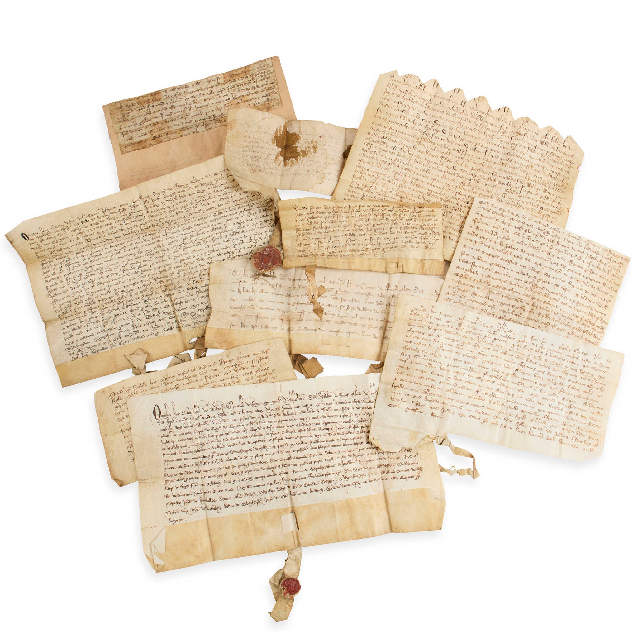 Euphemia, Countess of Rose. Charter granting Sir George Lesley lands “until the said land with its appurtenances shall be lawfully discharged and recovered by us through our legitimate heirs”, dated 8th August 1394, 10 lines on vellum, 28 x 8cm, very faded, soiled, partial seal attached [Rose, Shaw & Innes p.138] (10)