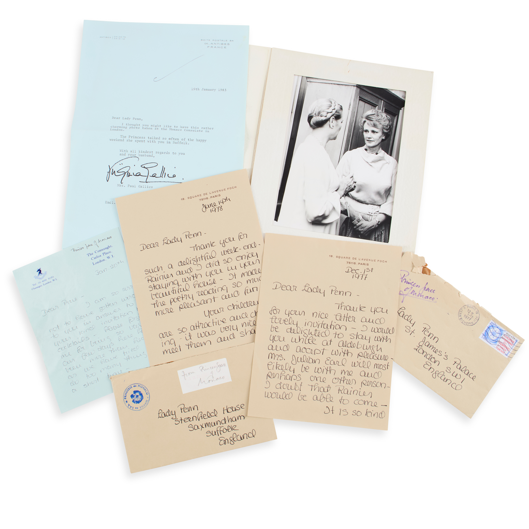The first dated Dec. 1st 1977 on 18. Square De l'Avenue Foch, Paris, headed notepaper, 21 x 16cm, written on both sides: “Dear Lady Penn, Thank you for your nice letter and lovely invitation - I would be delighted to stay with you while at Aldeburgh… I doubt that Rainier would be able to come…”, in franked envelope, signed Grace de Monaco;