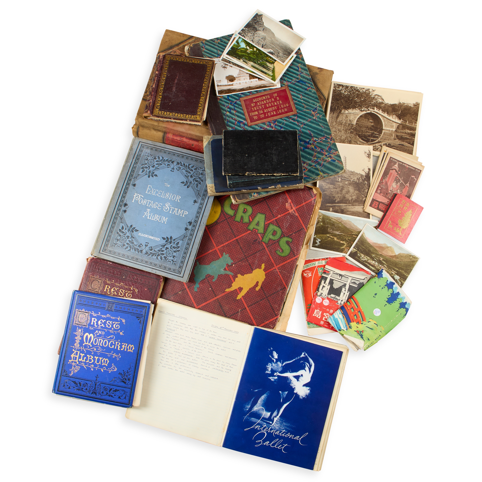 Travel journals, 6: early 20th century journals of H.P. Thompson (English) for Switzerland 1912, The French Riviera 1924, Austrian Tirol 1929, Bulgaria 1933, Bulgaria 1935 and Canada 1938; photographs (30+) of travel in China and Japan in 1931; early 20th century postcards of Japan (40+) and Canada (30+); slim photograph albums of early 20th century travel in Japan and China (3);