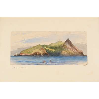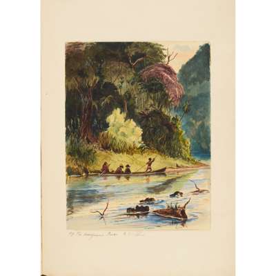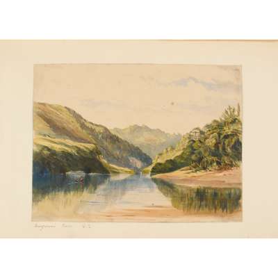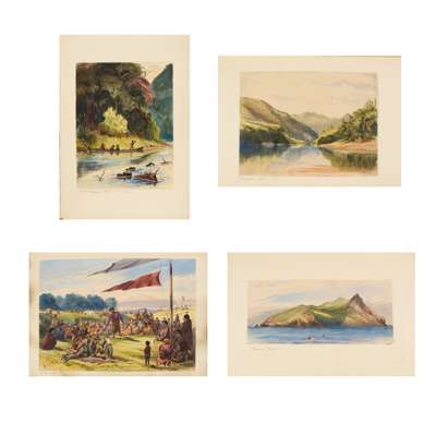 Large folio album (52 x 36cm) containing 45 topographical watercolours, mostly laid onto album leaves, including 13 watercolours of New Zealand (the Whanganui River, Wellington, Kaiwarawara, Paekākāriki, an impressive large illustration of a Māori meeting, a canoe trip up the Whanganui River etc.), one view of the Pitcairn Islands with figures in canoes, two views of St Thomas in the West Indies, and various views of Brazil, alongside paintings of views in France and Northern Ireland, watercolours ranging in size from 17.5 x 25cm to 33.5 x 47.5cm