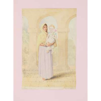 [Ayah and child], depicting a young European child held by a standing Indian lady in front of a round-arched colonnade pencil and watercolour on paper, 20.2 x 14.2cm, signed and dated in pencil at foot ‘C D’Oyly fecit, 12th June 1825';