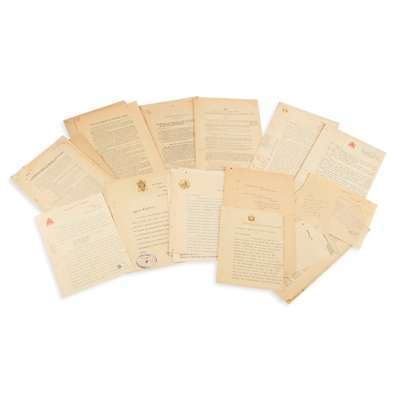 all typed and with maharaja's autograph signature, addressed to the presiding chancellor of the Chamber of Princes (by name or title), on the relevant maharaja's official stationery with embossed letterhead (either a single sheet or bifolium, 4to and foolscap), stitch- or punch holes in fore margins, adhesive residue on versos, various official annotations and ink-stamps. Comprising: