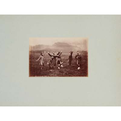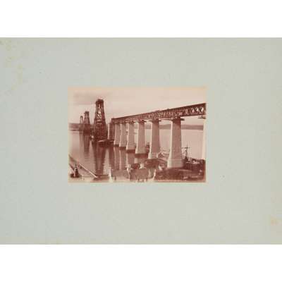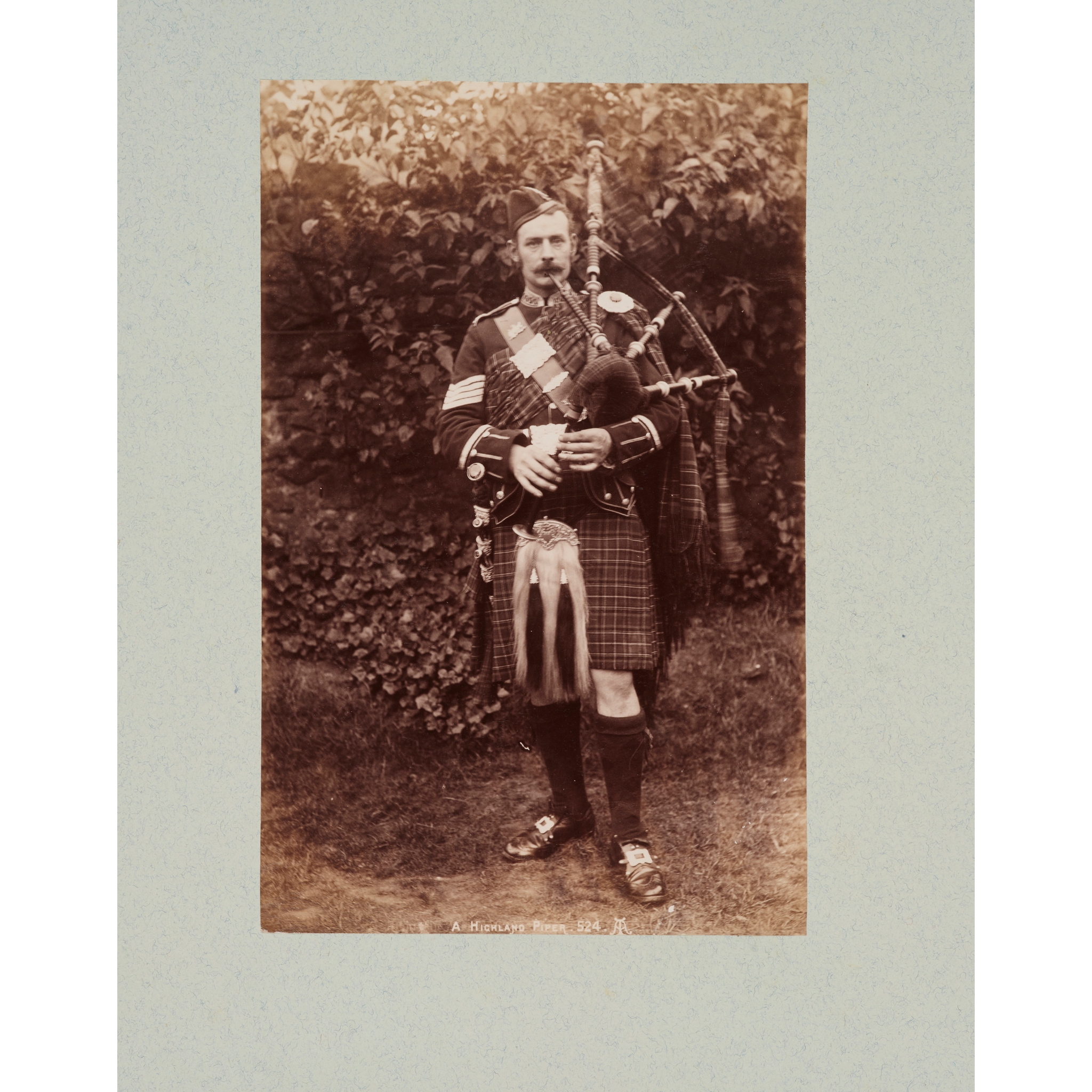 Albumen photographs of Scotland, including commercial photographs by G.W. Wilson, James Valentine and James Patrick, with views of Edinburgh, the Forth Bridge Under Construction, Royal Deeside, Inverness, the West Coast of Scotland down to Greenock, Glasgow, the Western Isles, men in Highland Dress, a Piper, Fishwives and a Scottish soldier, and a number of amateur photographs, all in leather album embossed with thistle and lion rampant motifs and the Scottish Latin motto Nemo Me Impune Lacessit, 46 x 34.5cm, joints a little split