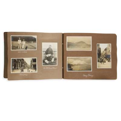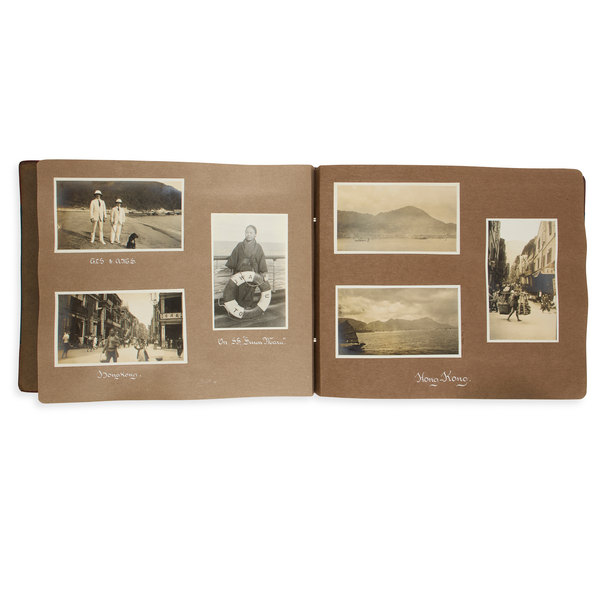 Oblong 4to (23.8 x 28cm), contemporary half morocco album, containing 128 silver gelatin prints, all apparently personal snapshots, 7 x 12.5cm or reverse, mounted rectos and versos, manuscript captions throughout in white ink, depicting a voyage from Quebec across Canada to Vancouver, thence to Japan (Yokohama) and China, including stops in Swatow, Shanghai and the Yangtze, Hongkong, Singapore and Kuala Lumpur, including views, street scenes, locals, coolies, houseboats, gardens, etc. Together with an album of albumen prints of Italian statuary and architecture, c.1880 (2)