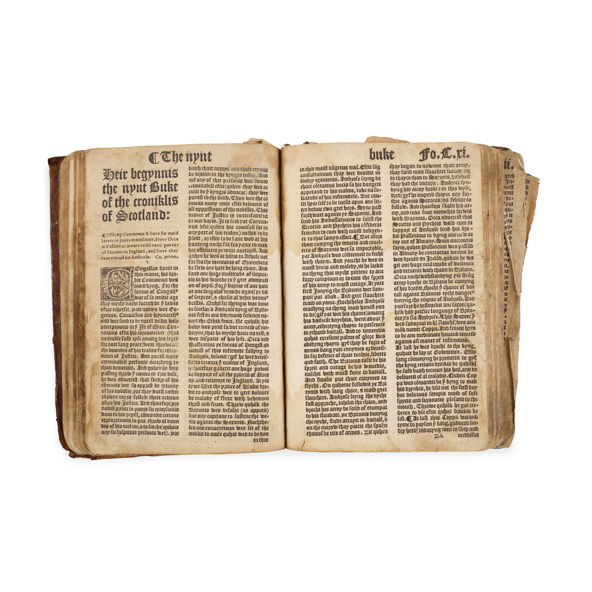 [Edinburgh: Thomas Davidson, 1540.] Small folio (26 x 18cm), first edition of the translation of Scotorum historia into Scots, contemporary panelled calf, boards detached, covers very rubbed and worn, spine flaking, lacking title-page and another initial leaf, much of gathering A loose and worn with the large part of the text missing, lacking C1 and 1[rum] 4-8 (i.e. lacking C1 and the final 5 leaves, including colophon), a few holes and tears slightly affecting text with 2S1 sporting a tear to lower margin affecting a few sentences, dust-soiling, dampstaining and some browning internally [ESTC S107092]