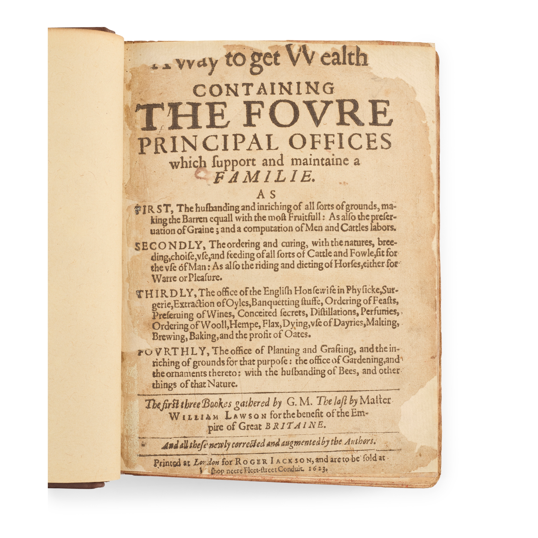 London: Roger Jackson, 1623. Small 4to, title-pages repaired with some loss to text of initial title; [bound with] Markhams farewell to Husbandry… London: Roger Jackson, 1620. Small 4to, a little dampstaining to a few leaves, V2 torn and repaired with some loss to text; [bound with] Country Contentments, or The English Huswife. London: R. Jackson, 1623. Small 4to, annotations in an early hand to final leaf (blank); [bound with] A New Orchard and Garden. London: Roger Jackson, 1623. Small 4to; [bound with] The Country Housewife's Garden. London: Roger Jackson, 1623. Small 4to, lacking A1 (half-title or initial blank?); [also bound with:] A most profitable new treatise, from approved experience of the art of propagation, by Simon Howard; and: The Husband-Mans fruitfull orchard; modern brown calf gilt