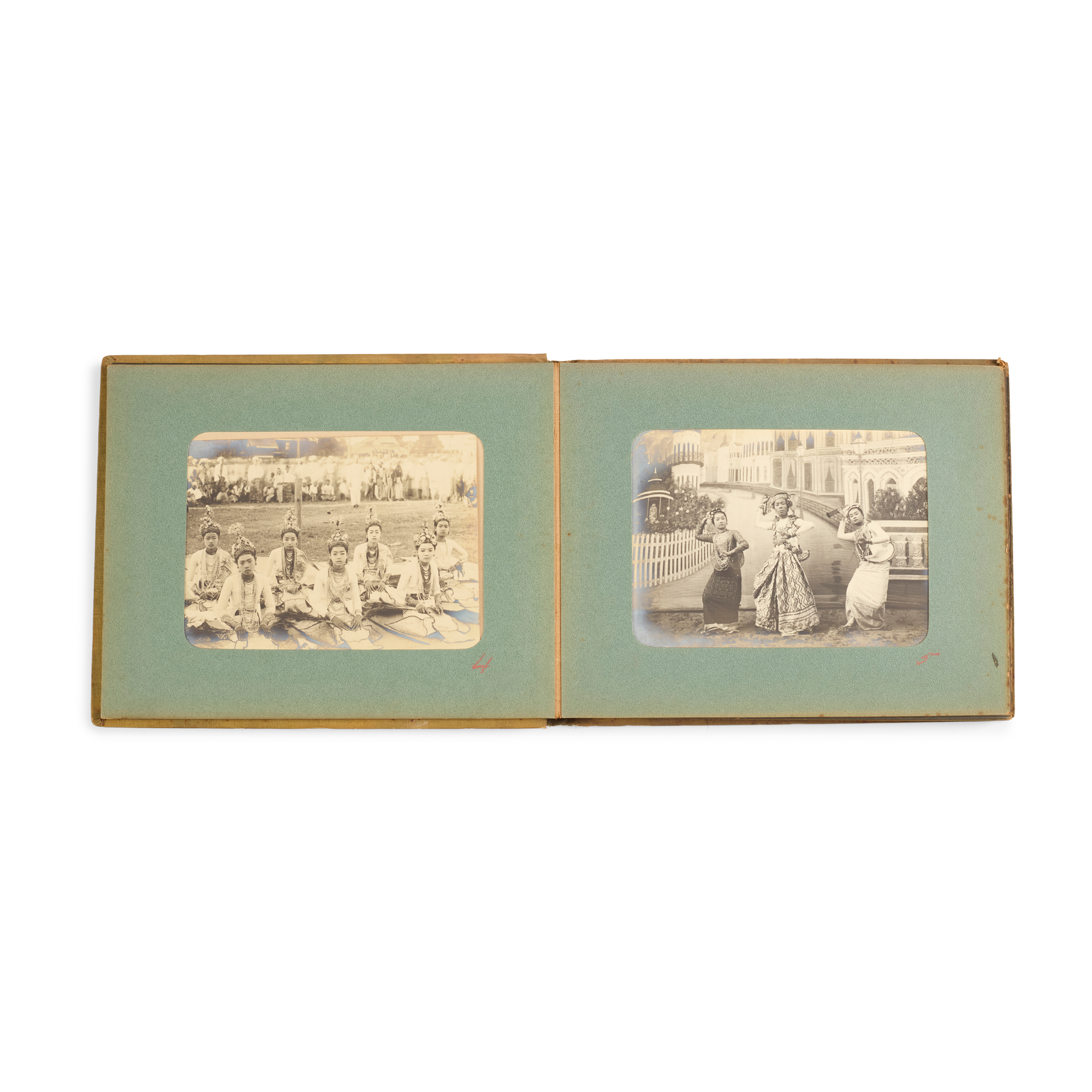 [cover-title]. Myanaung, Burma [Myanmar]: John L. Francis, c.1900. Oblong 4to green cloth album, 24 silver bromide photographs (11 x 15cm), window-mounted in rectos and versos of stiff card leaves (17.5 x 23cm), leaf of studio's stationery with manuscript list of contents tipped to rear pastedown, variable oxidation (chiefly around edges), covers marked