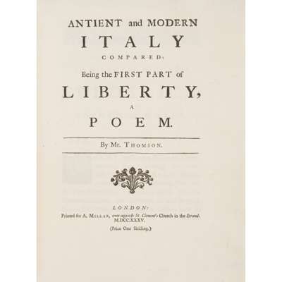 [comprising:] Antient and Modern Liberty compared: being the First Part of Liberty, a Poem; Greece: being the Second Part; Rome: being the Third Part; Britain: being the Fourth Part; The Prospect: being the Fifth Part. London: for A. Millar, 1735-6. 5 parts in 1 volume, 4to (28.1 x 21.4cm), contemporary sprinkled calf, gilt spine, red morocco label, half-title to each part, final advertisement leaf to parts 1 and 5, part 1 title-page retaining price ‘one shilling’ at foot [Rothschild 2425 for part 1]