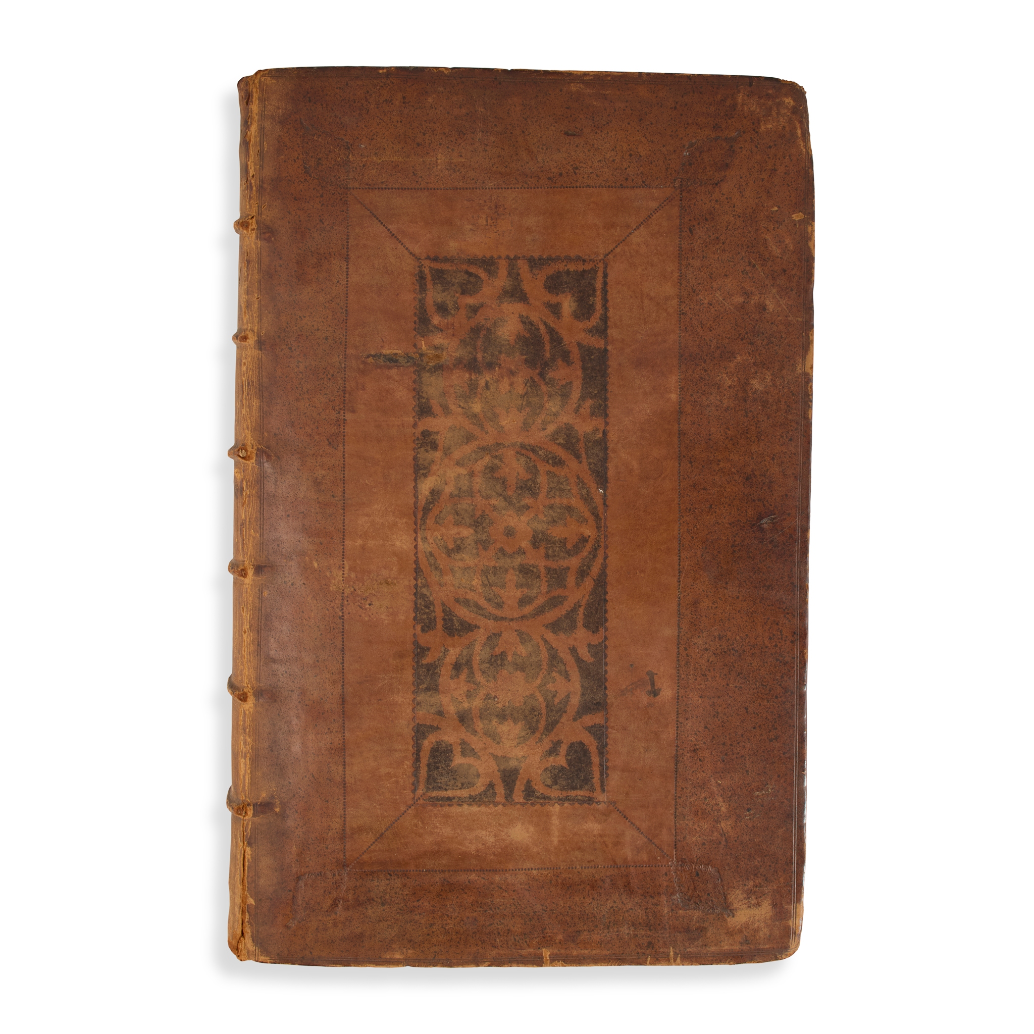 containing the Lives, Opinions, Actions and Discourses of the Philosophers of Every Sect. By Thomas Stanley. London: for W. Battersby [and others], 1700. Third edition, folio (36.4 x 23cm), contemporary panelled calf, covers with decorative central panels of stencilled arabesque designs incorporating heart motifs, [36] 658 [12], [4] 63 [1] pp., engraved portrait frontispiece, title-page printed in red and black, engraved full-length portraits of philosophers throughout the text, 'The history of the Chaldaick Philosophy' with separate dated title-page, engraved bookplate of the Right Honourable the Lord John Drummond to verso of title-page, binding rubbed, small section of skinning to lower corner of rear board, moderate spotting and browning to contents, paper-disruption to 3Q2 [ESTC T102824];