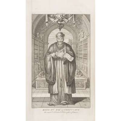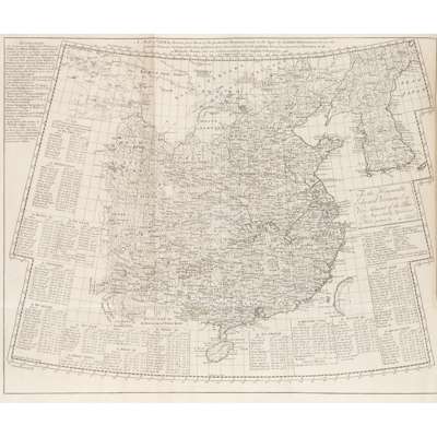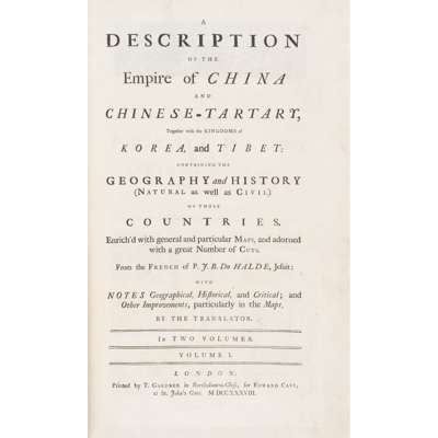 together with the Kingdoms of Korea, and Tibet … With Notes Geographical, Historical and Critical; and Other Improvements, particularly in the Maps, by the Translator. London: by T. Gardner, for Edward Cave, 1738-41. 2 volumes, folio (40 x 24.6cm), contemporary sprinkled calf, spine-compartments ruled in gilt, morocco labels, edges sprinkled red, [4] xi [4] ii-xii 678, [4] 235 [1] 245-388 [10] pp., 64 engraved maps and plates (most of them folding), volume 1 with old oil-stain to inner margins of general map (bound facing title-page) and sigs. O1-2, plate of Confucius (listed to face p. 415) bound as frontispiece, plate 26 ('Plan of the Que tse-Kyen, listed to face p. 295) bound facing p. 660, volume 2 4H1 with extensive closed tear down fore margin, engraved music plate with short nick to fore margin, ‘The Observatory at Peking’ plate with tear to fore margin (one extending into image), a2 (index) with closed tear in text [ESTC T148343]